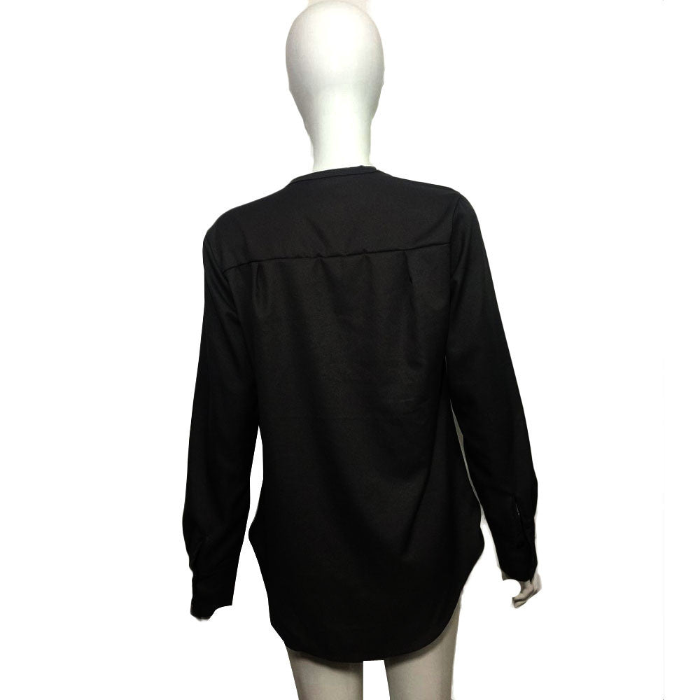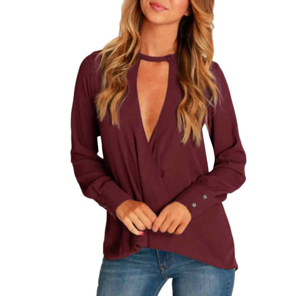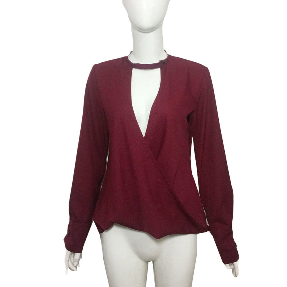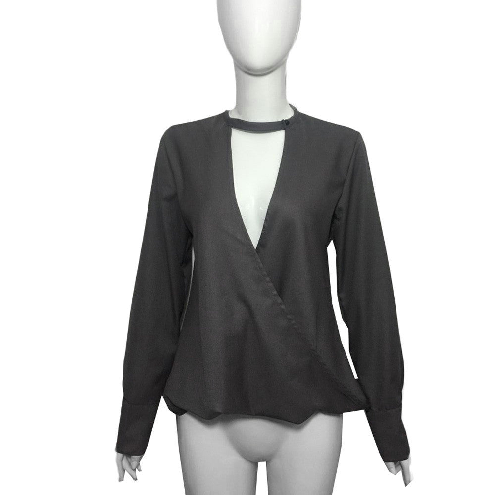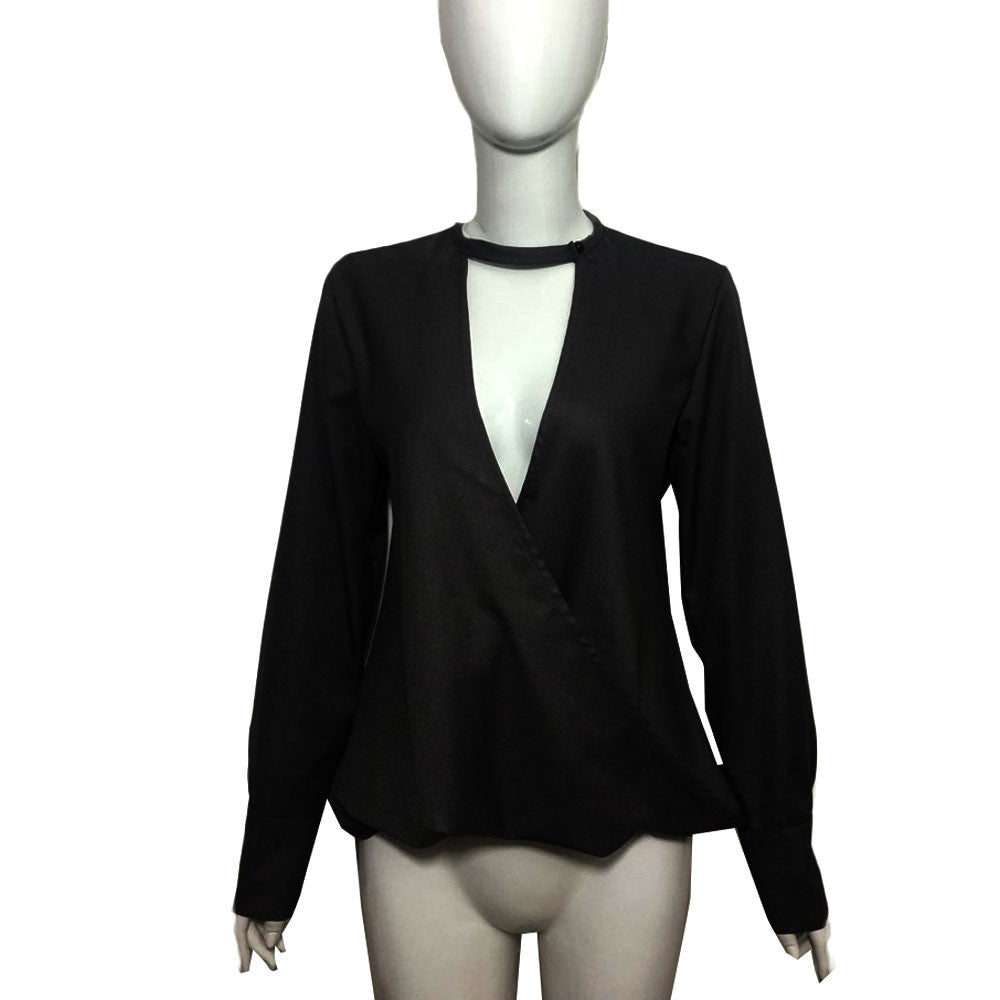 Blusas feminina Women Sexy Choker Neck Deep V Loose Casual Long Sleeve Chiffon Blouse Tops Shirt IMY66