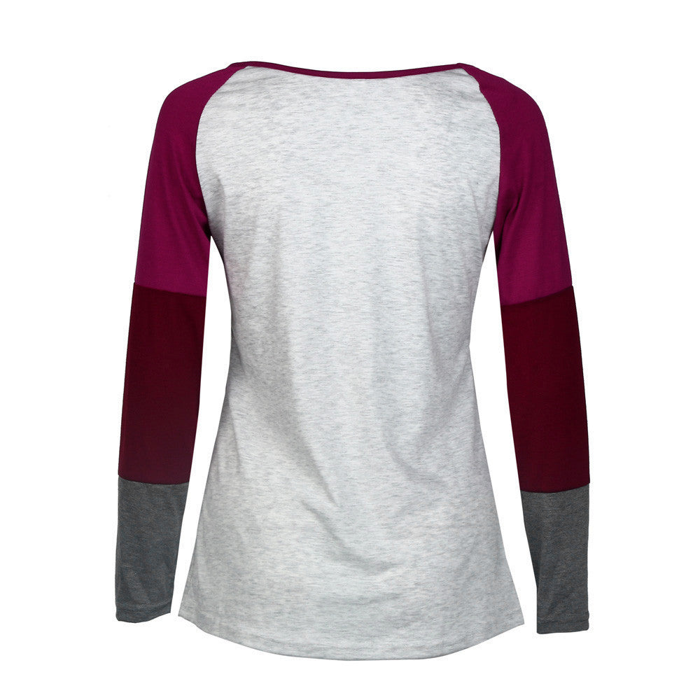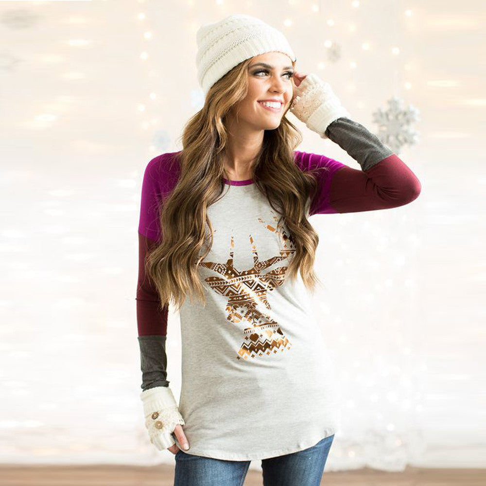Casual T-Shirts For Women Loose Elk Print Long Sleeve Round Neck Splice Pullover Tee Shirt femme camisetas y tops IMY66