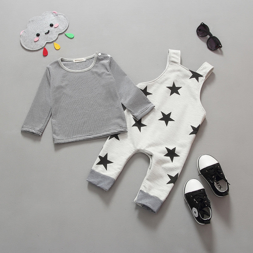 Children Kids Baby Boys Clothing Sets Suits Stripe Long Sleeve T-shirt Tops+ Printed Bib Pants Overall Outfits IMY66