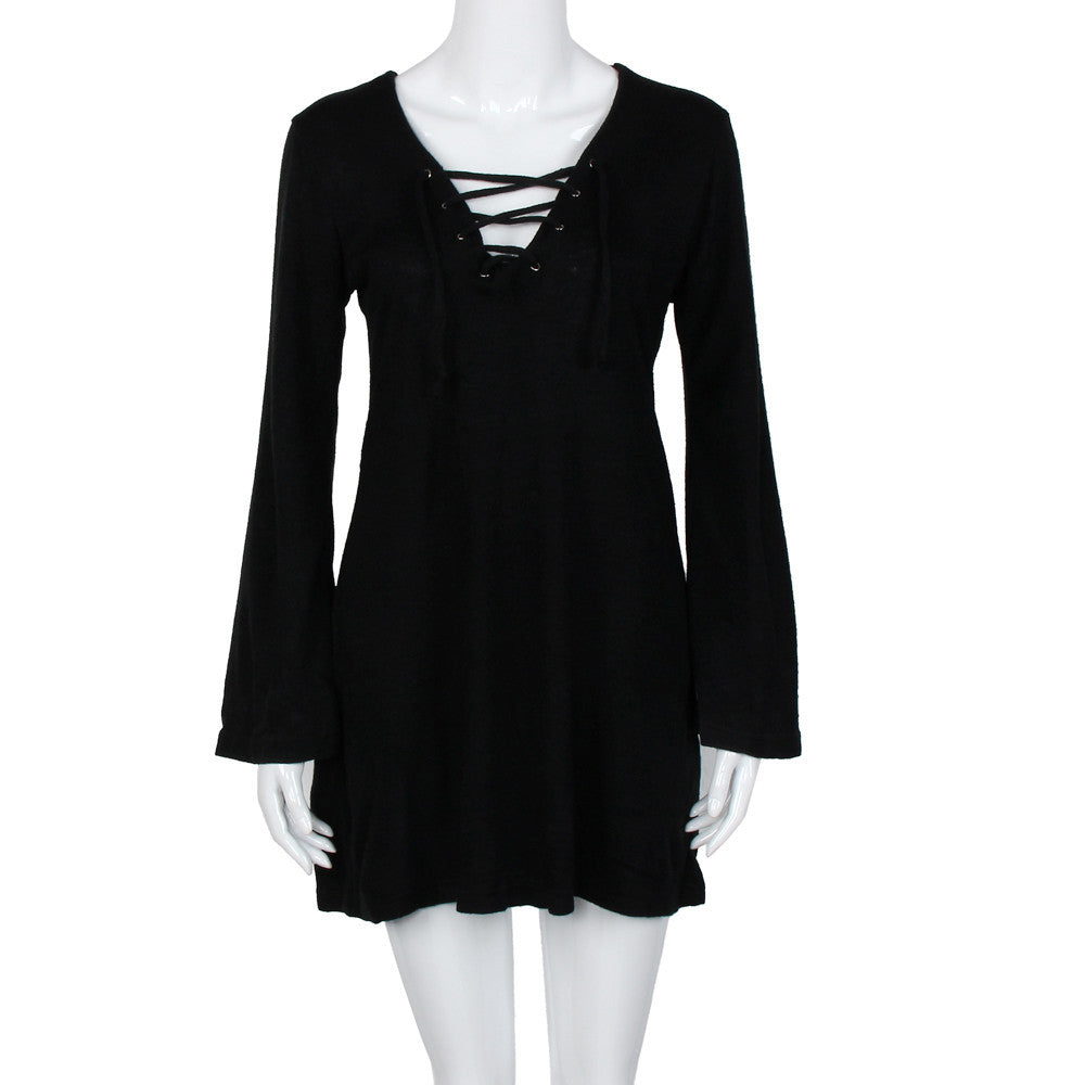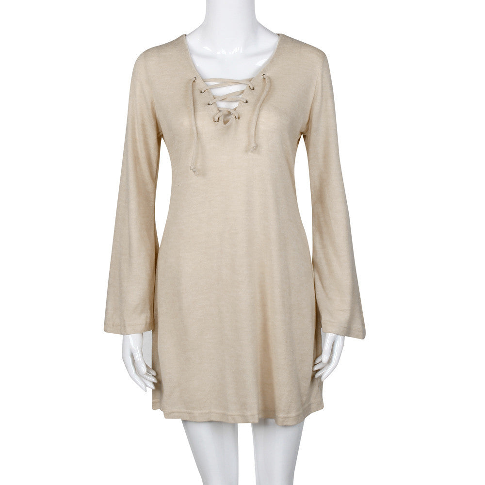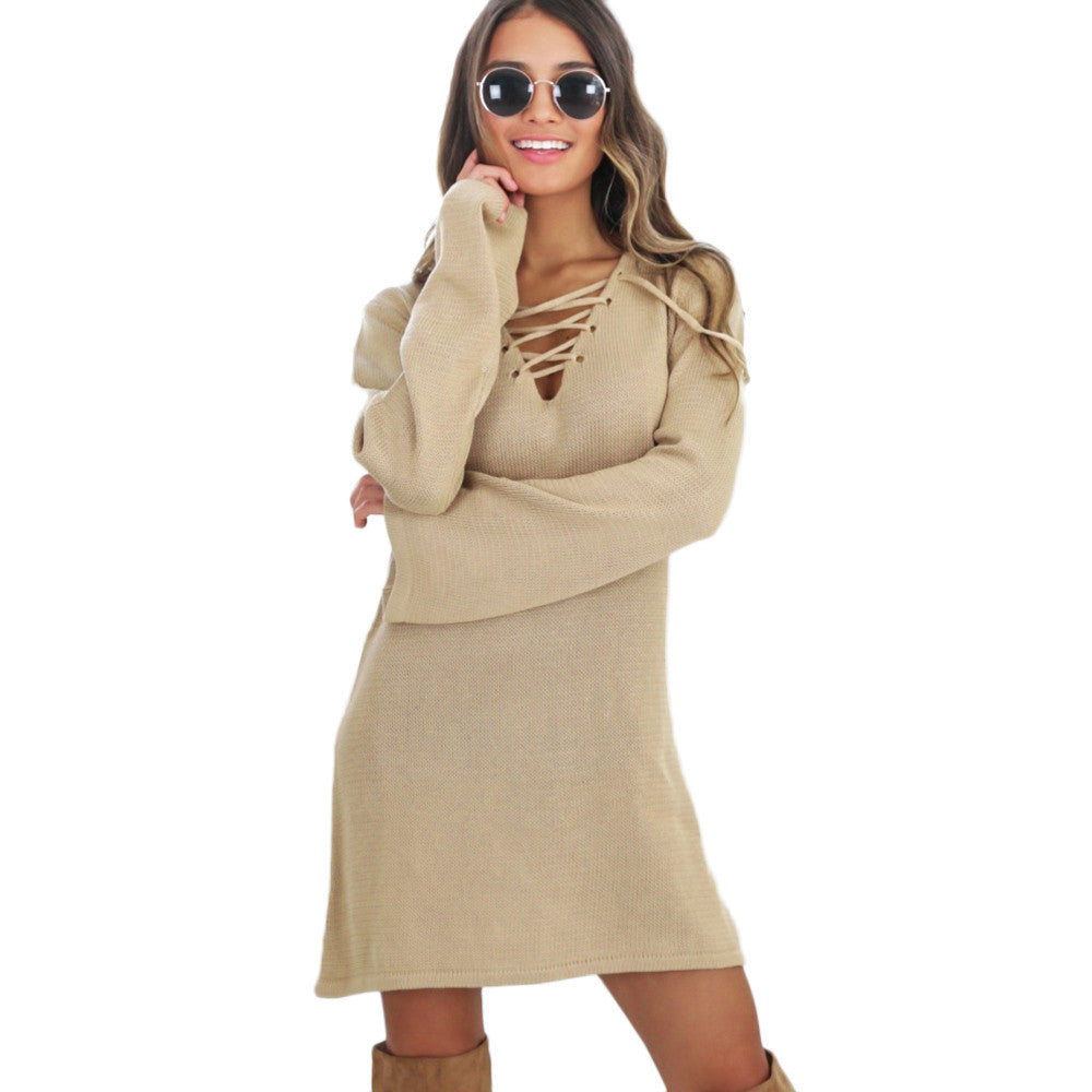 Dress Women Sexy Lace Up V-neck Sweater Knitted Dresses Bandage Flare Sleeve Dress Femme Vestidos Feminino IMY66
