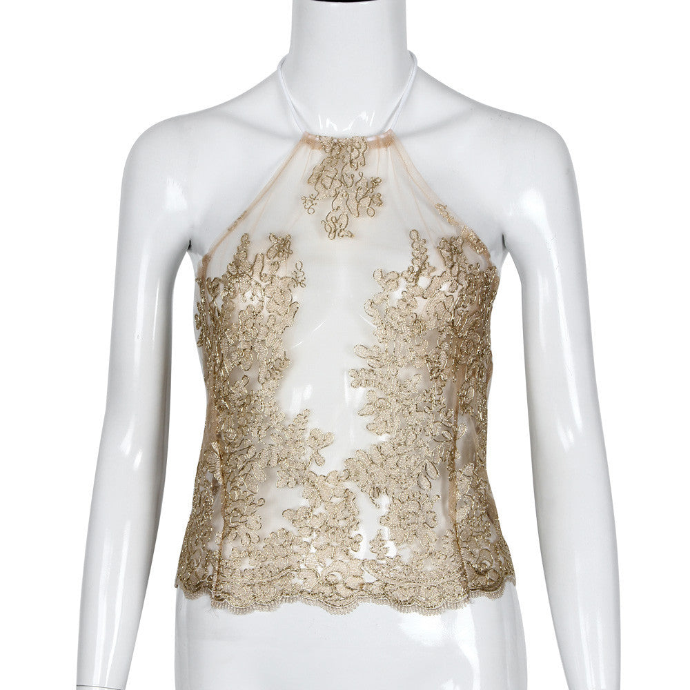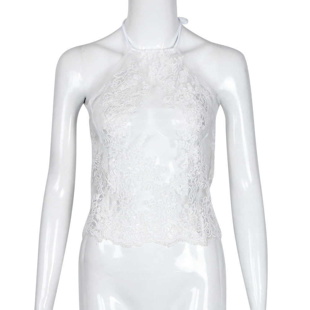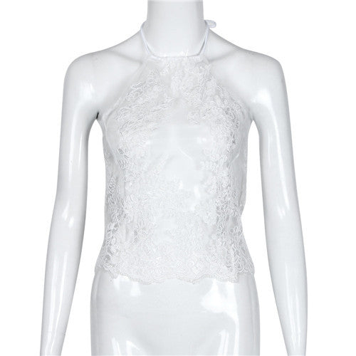 Elegant white lace crop top beach backless short halter tops Sexy halter camis gauze metallic women tank top IMY66