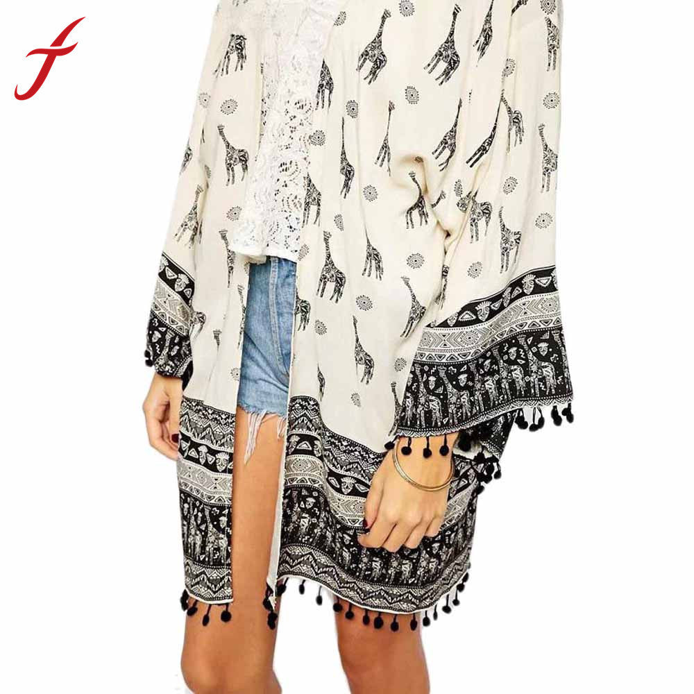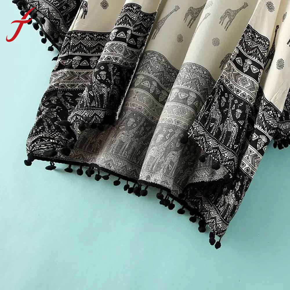 Ethnic Deer Floral Print Loose Kimono Cardigan Crochet Tassels Hem Women's Shirts No Button Blouses Tops IMY66