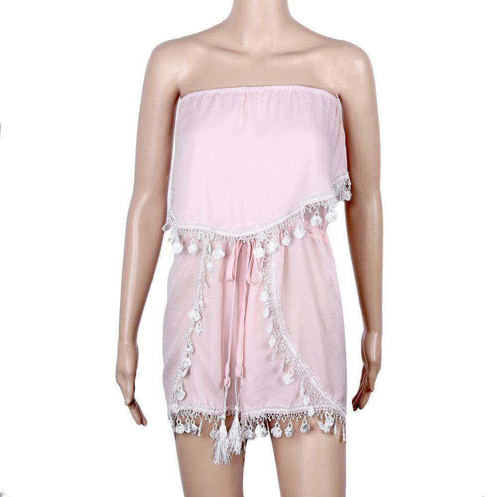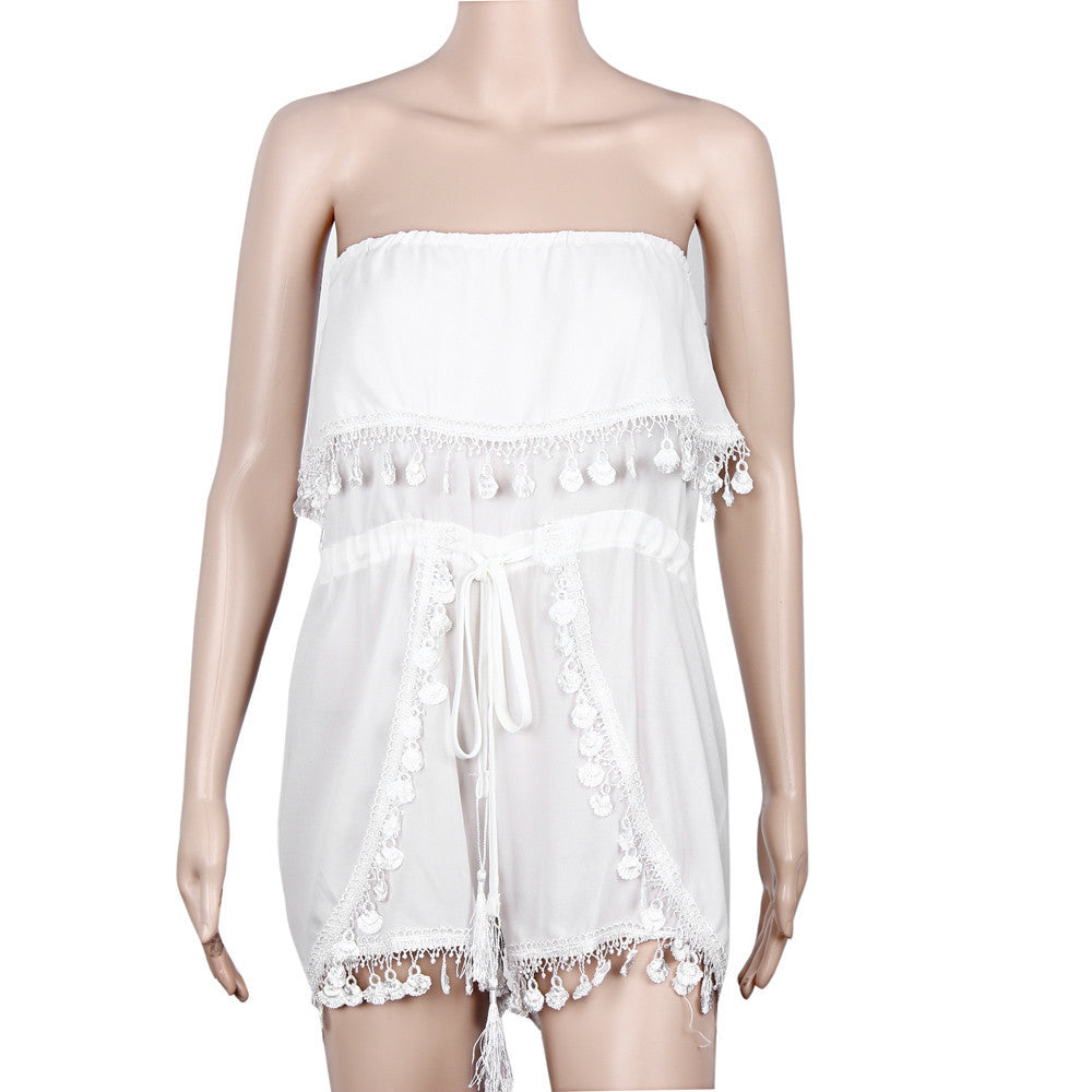Jumpsuit Women Sexy Off shoulder Short Sleeve High Waist Chiffon Tassel Overall Beach Macacao Feminino Overalls IMY66