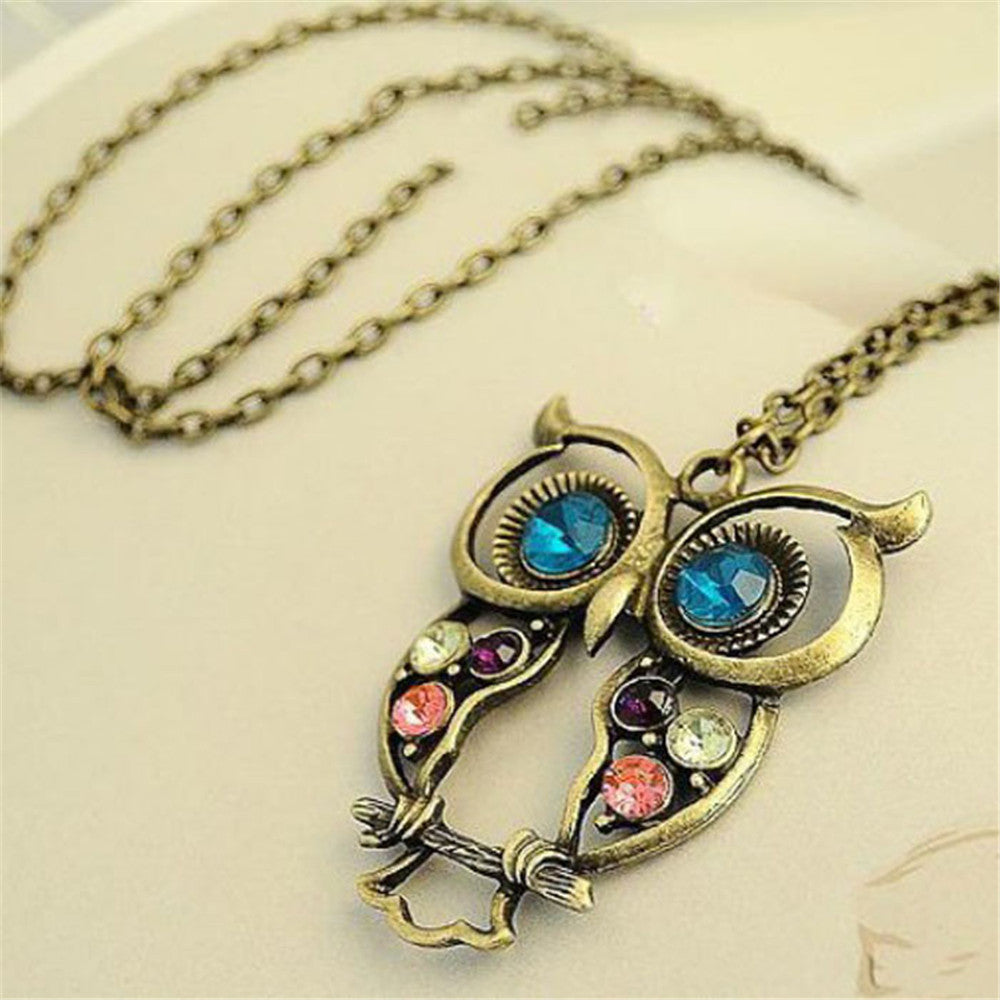 Lady Crystal Big Blue Eyed Owl Long Chain Pendant Sweater Coat Necklace IMY66