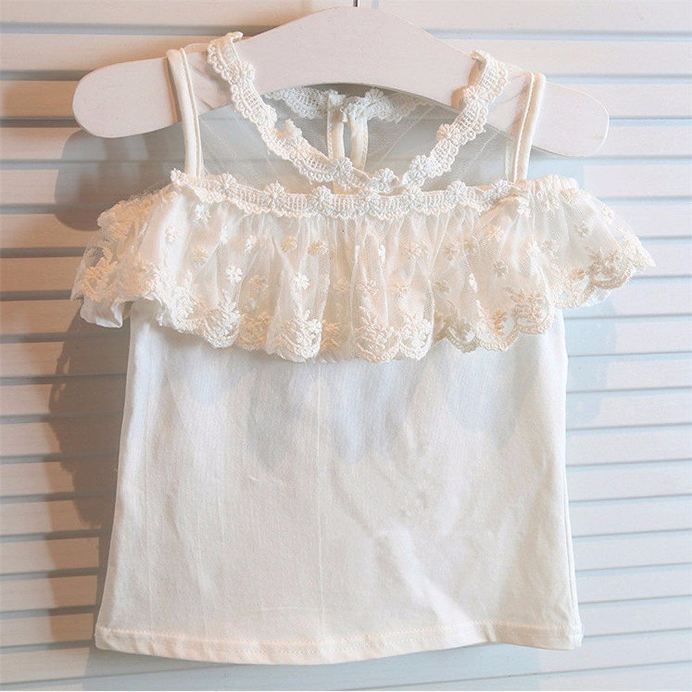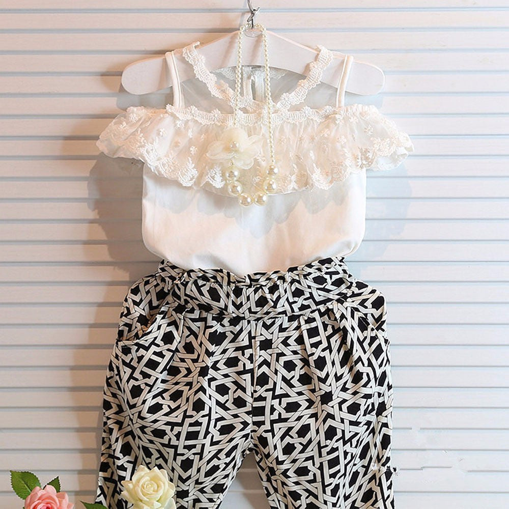 Lovely Kids Girls Clothes Off Shoulder Strapless Sling Lace Shirt Tops+Plaid Pants Clothing 2 Piece Set IMY66