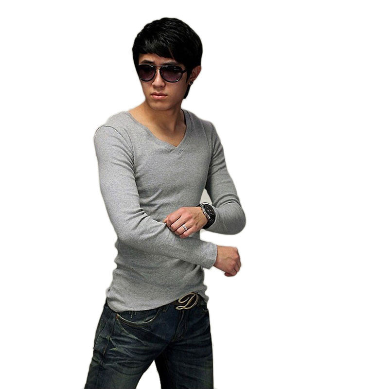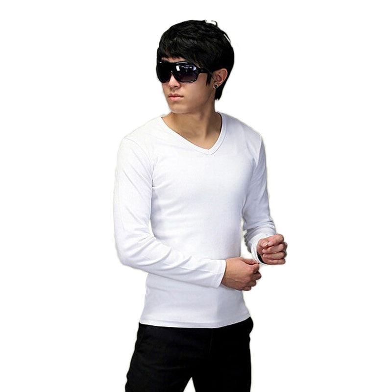 Men Shirt Real Solid Broadcloth No Full Men Slim Fit Cotton V-neck Long Sleeve T-shirt Tops IMY66