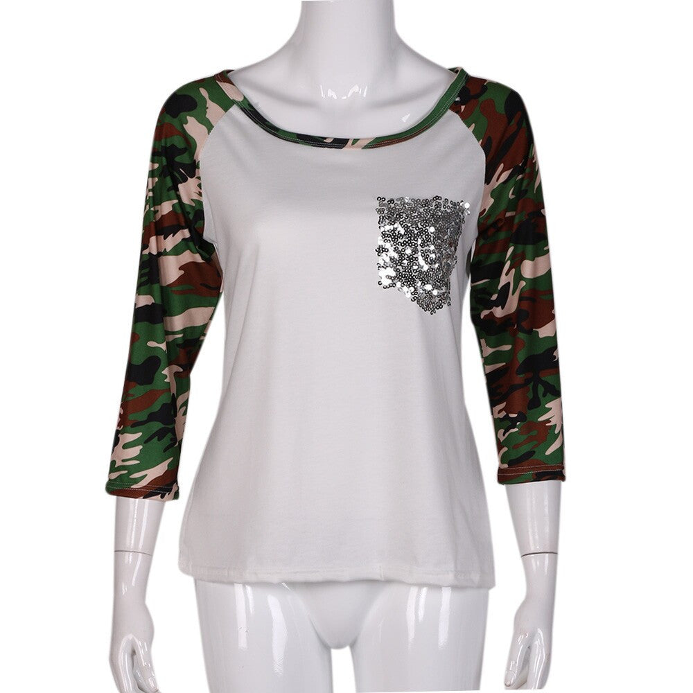 Patchwork T-Shirt Women Camouflage Print Three Quarter Tee shirt femme Blusas Femininas camisetas y top IMY66