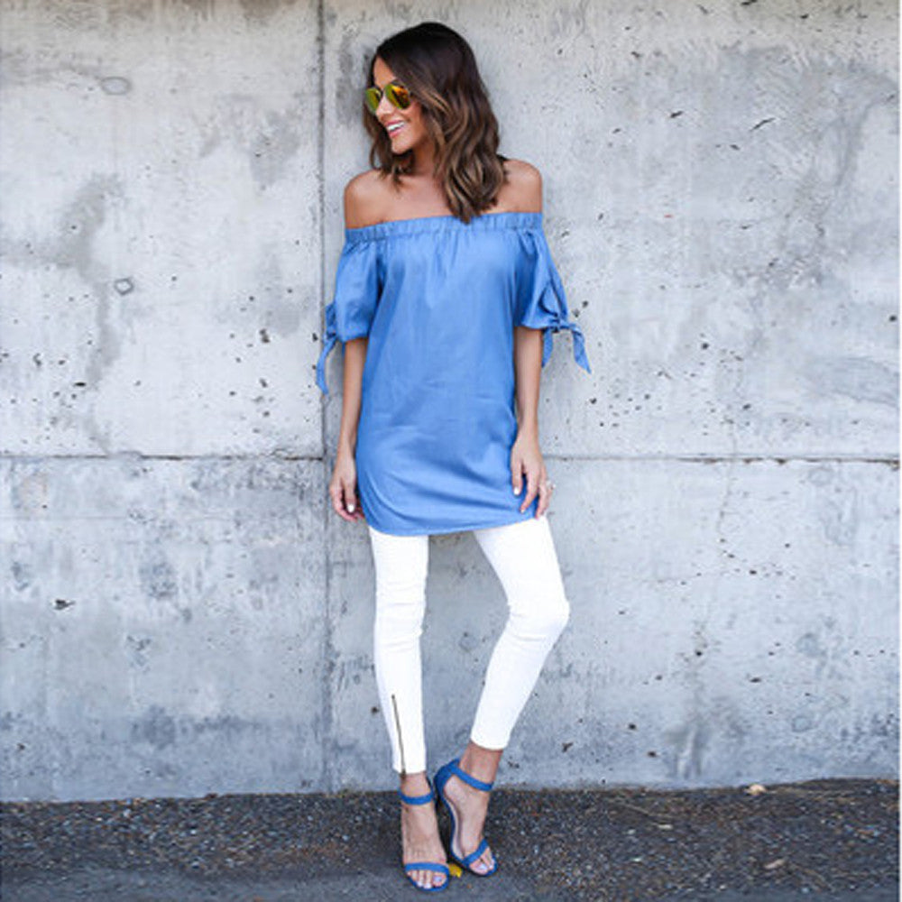 Sexy Blouse Women Beach Short Sleeve Bow Blue Off Shoulder Female Long Blouse Shirt Tops Dress blusa feminino IMY66