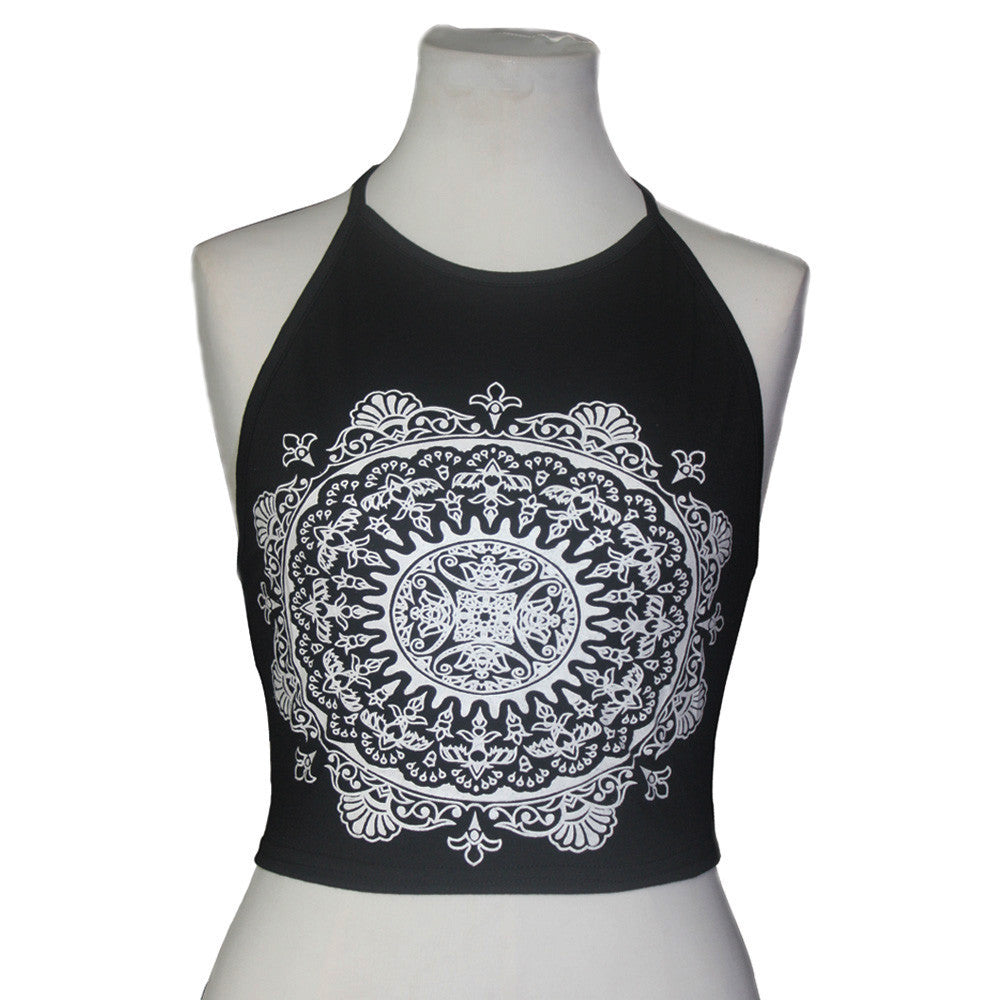 Sexy Bustier Crop Tops For Women Sleeveless Blackless Mandala Print Fitness Short Halter Tank Tops IMY66