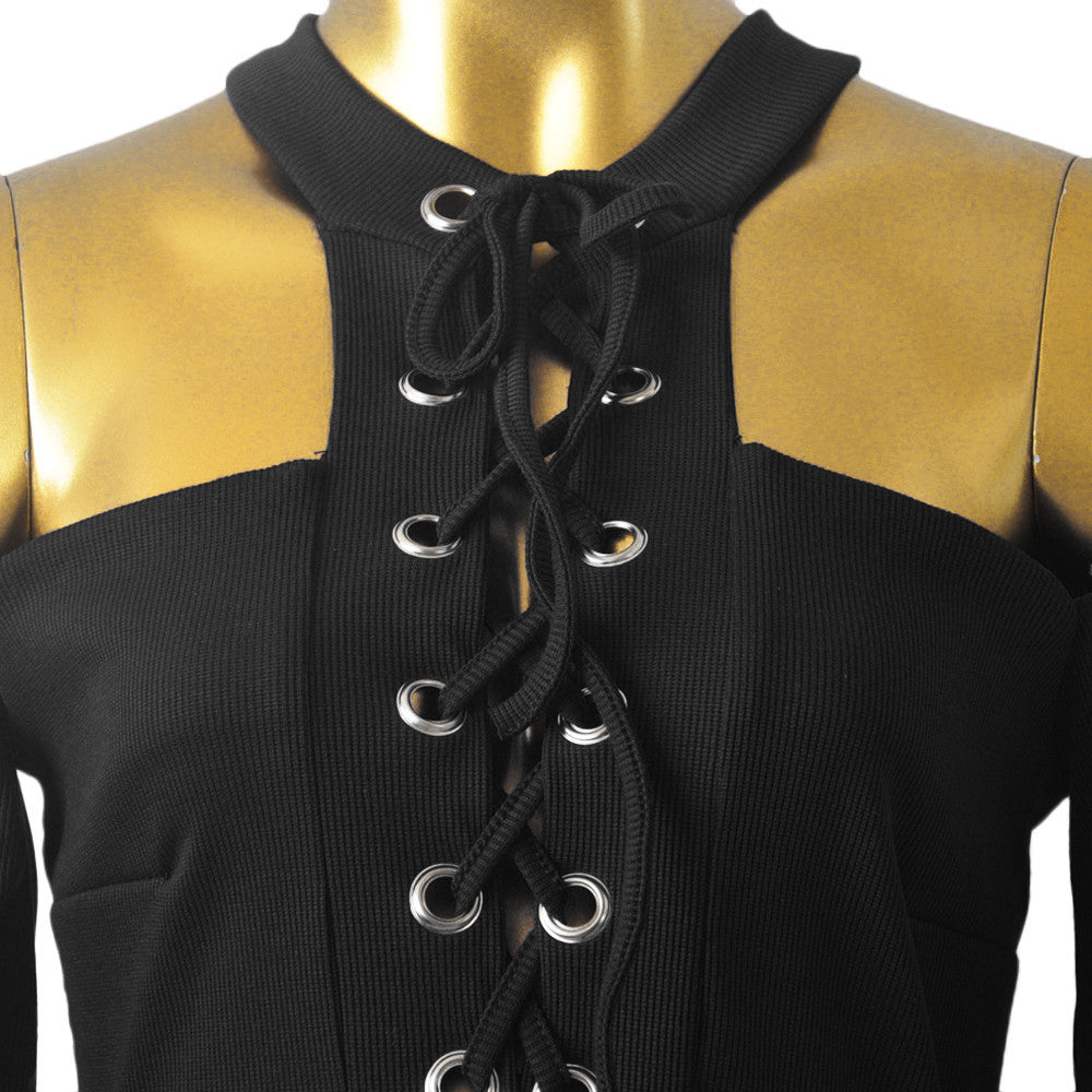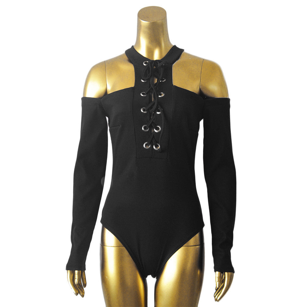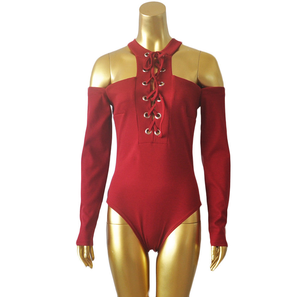 Sexy Rompers Women Jumpsuit Off Shoulder Lace Up Long Sleeve Hollow Out Bandage Bodysuits Tops Blouse Tee Shirt IMY66