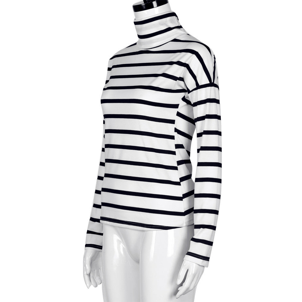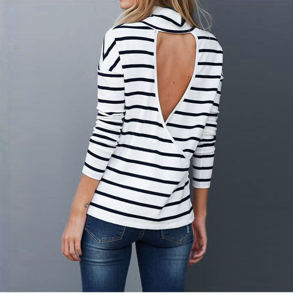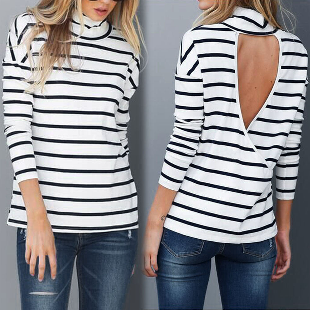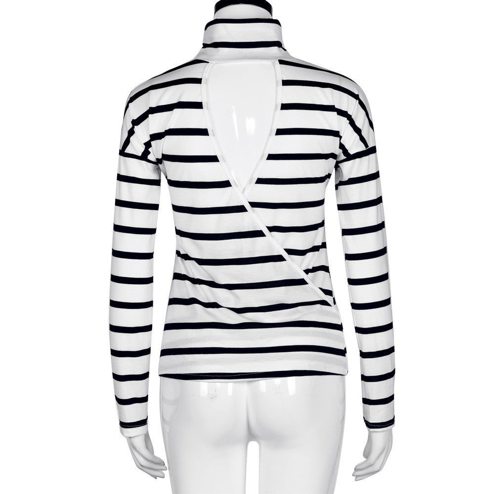 Sexy Striped T-Shirts For Women Casual Turtleneck Backless Long Sleeve T-Shirt Tops T-Shirt femme camiseta mujer IMY66