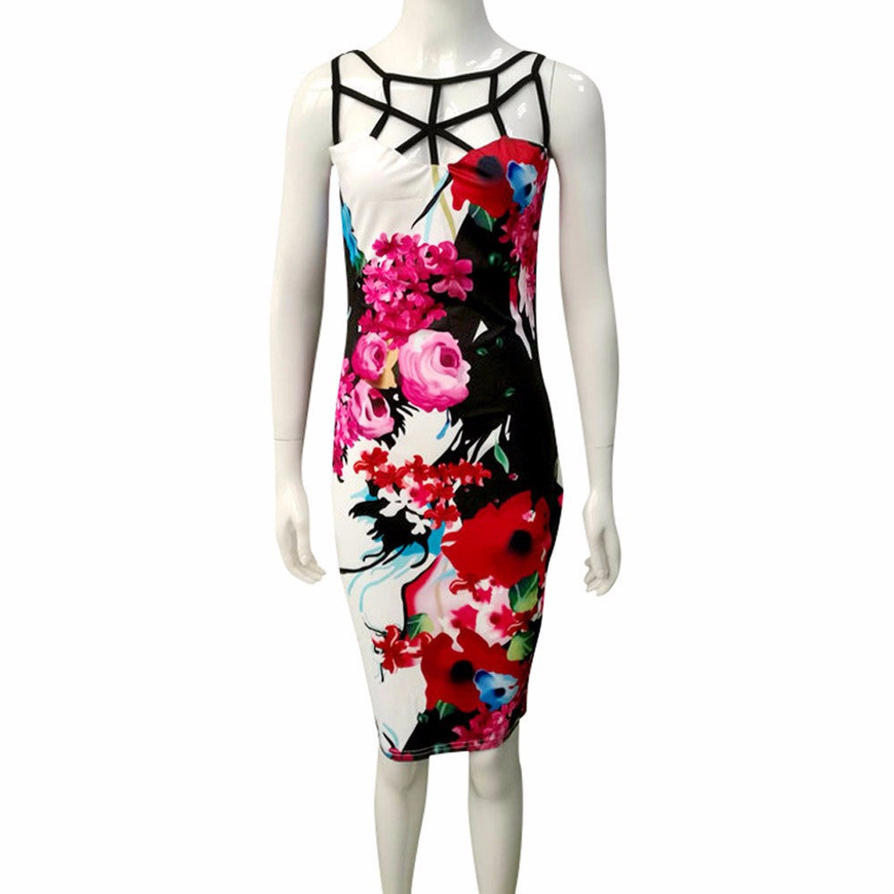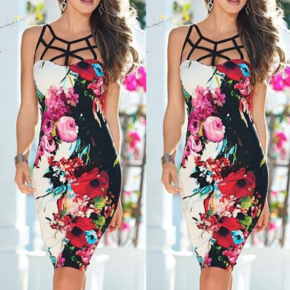 Sexy Women Bandage Bodycon Dress Ladies Sleeveless Floral Print Hollow Party Mini Dress vestidos femininos IMY66
