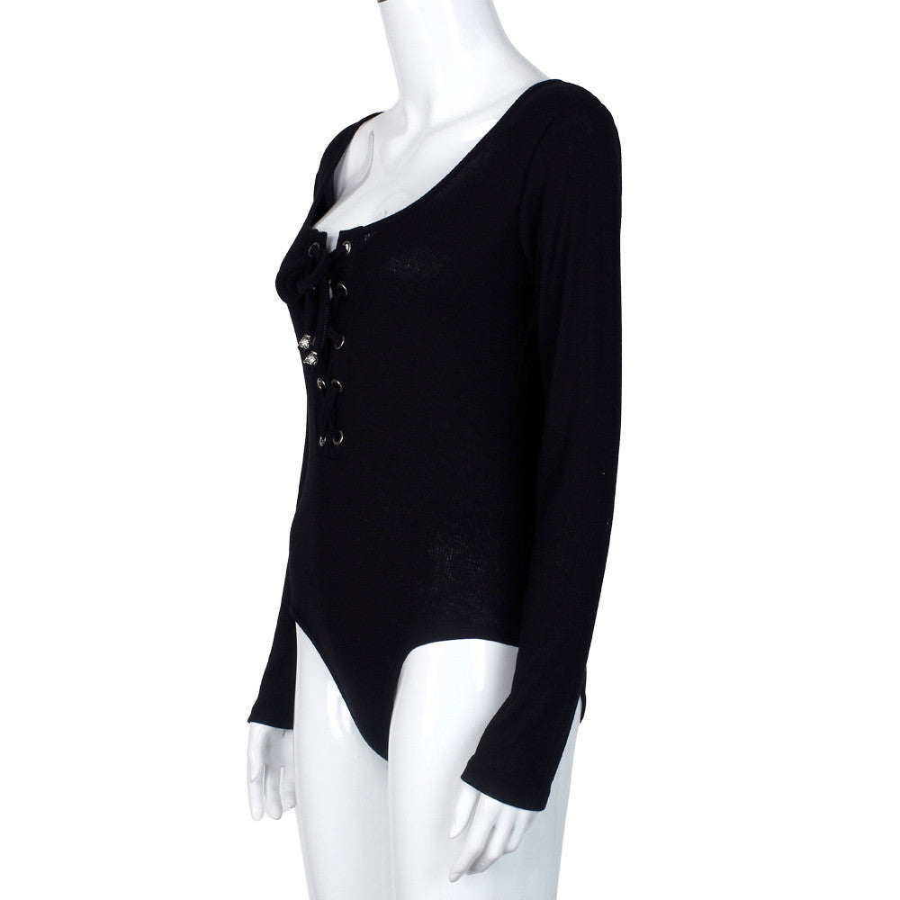 Sexy Women Lace Up Bodysuit T-Shirts Ladies One Piece Long Sleeve Stretch Jumpsuit Tops Casual Pull Femme IMY66