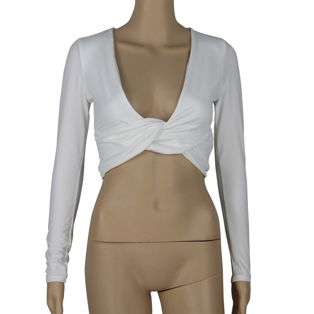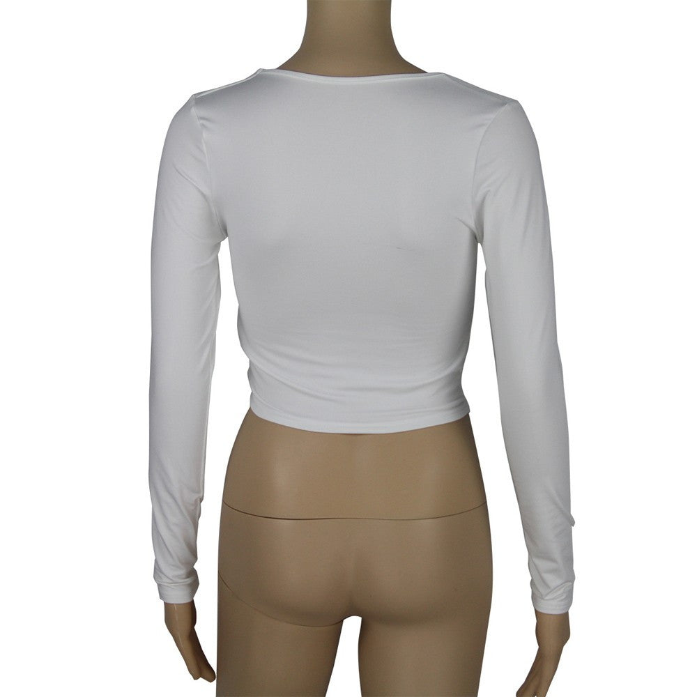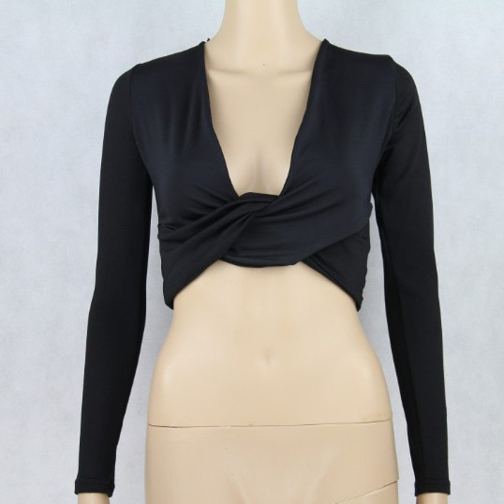 Sexy Women Short T-Shirts Deep V-Neck Cross Slim Crop Tops Long Sleeve Tee Shirt femme Camisetas Feminina IMY66