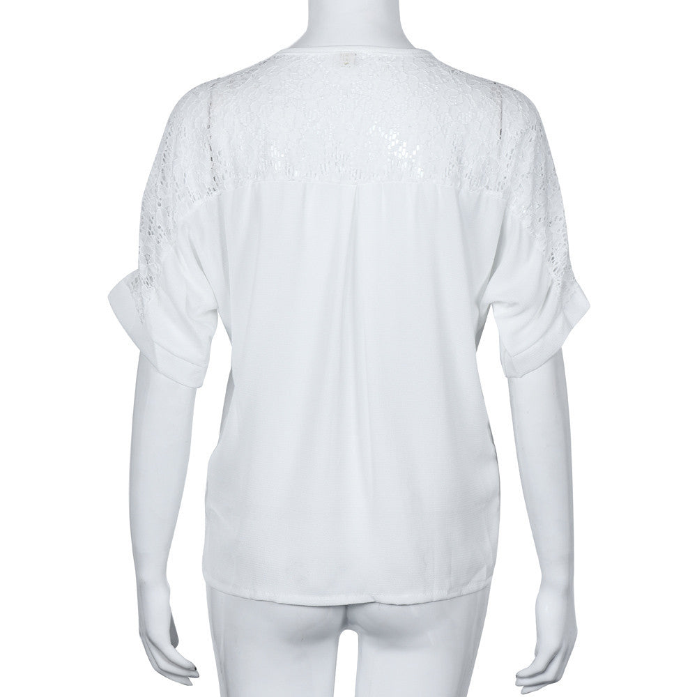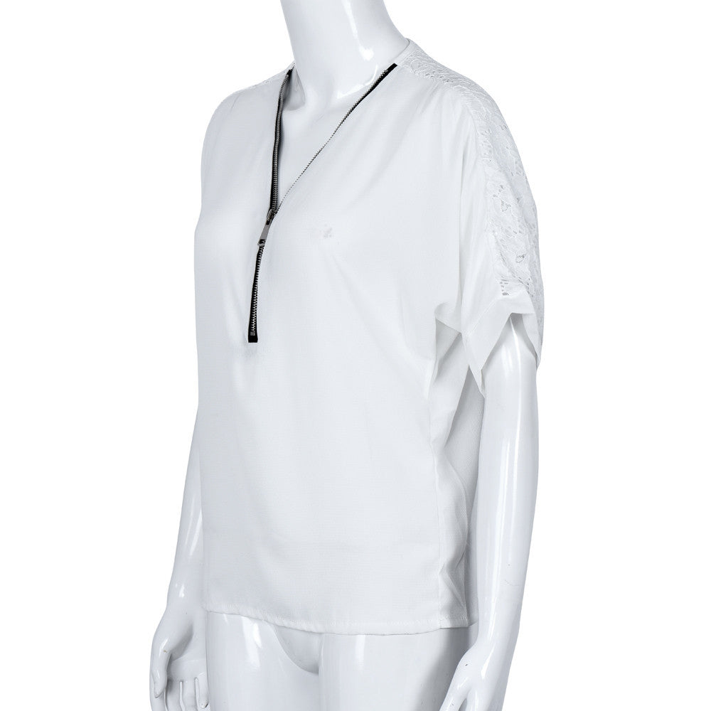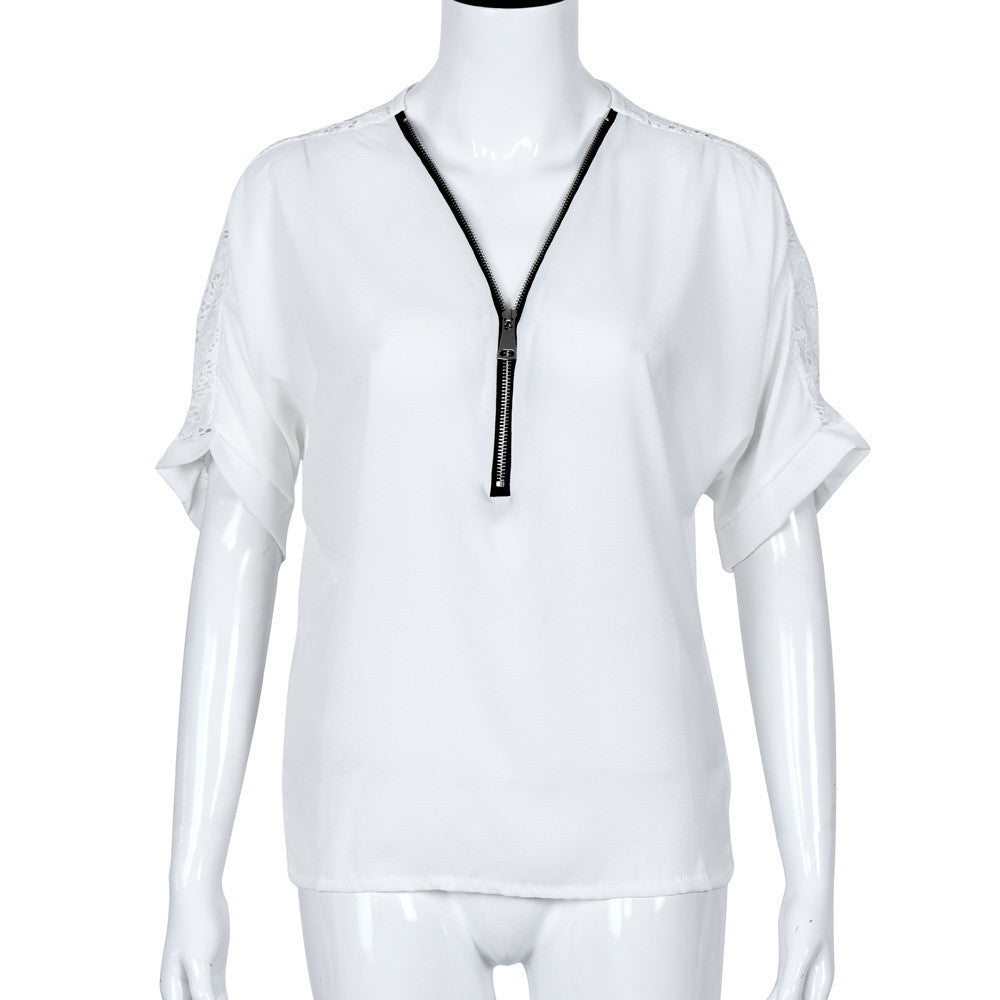 Style Sexy Women Blouse Lady Casual Short Sleeve V Neck Zipper Lace Chiffon Blouse Loose Top Shirt blusa feminino IMY66