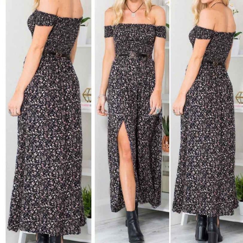 Style Women Long Dress Boho Flower Print Sexy Off Shoulder Beach Dress Open Fork Maxi Dress vestidos femininos IMY66