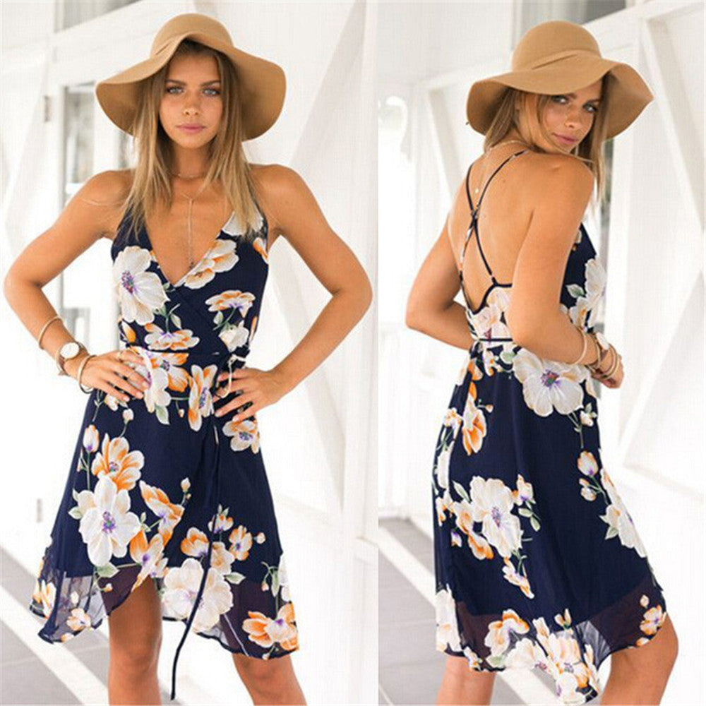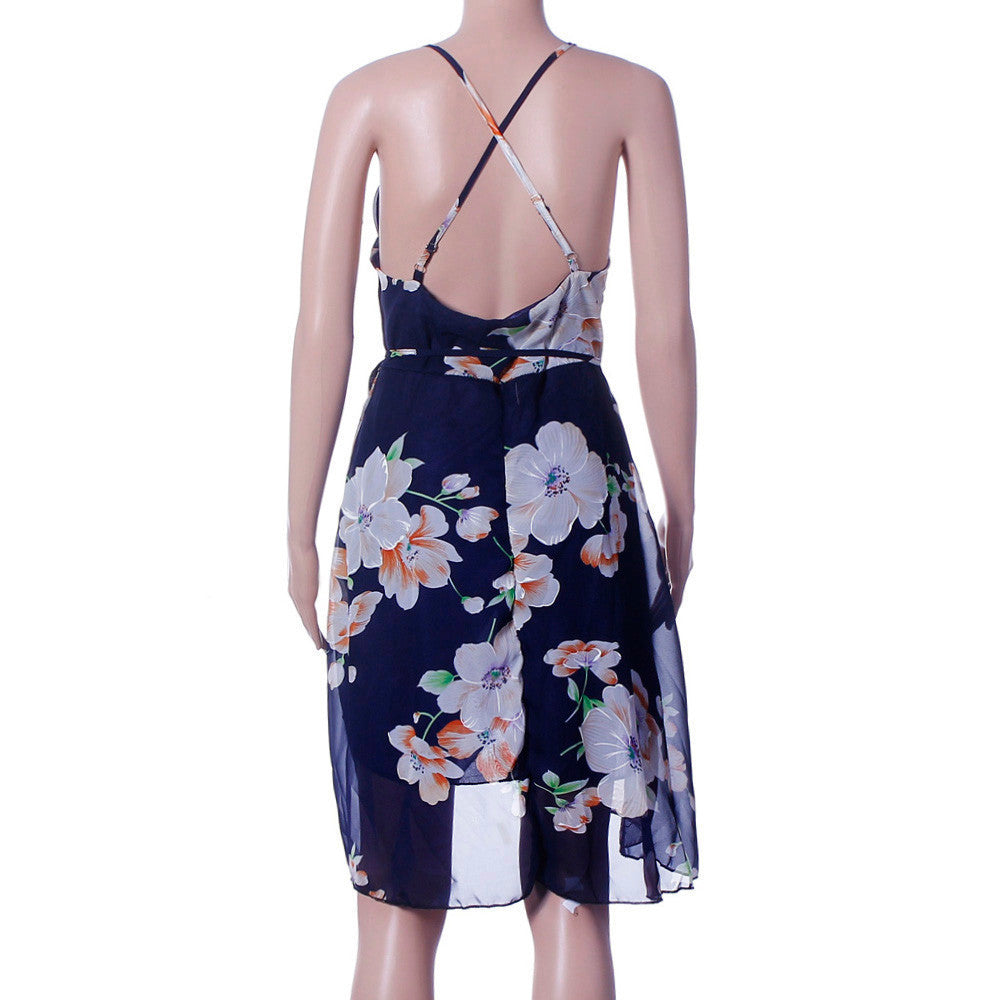 Style Women Sexy Dresses Bohemia Floral Printed Chiffon Open Fork Condole Belt Beach Dress vestidos IMY66