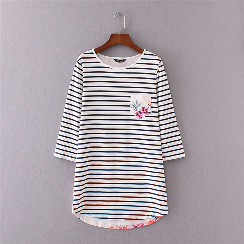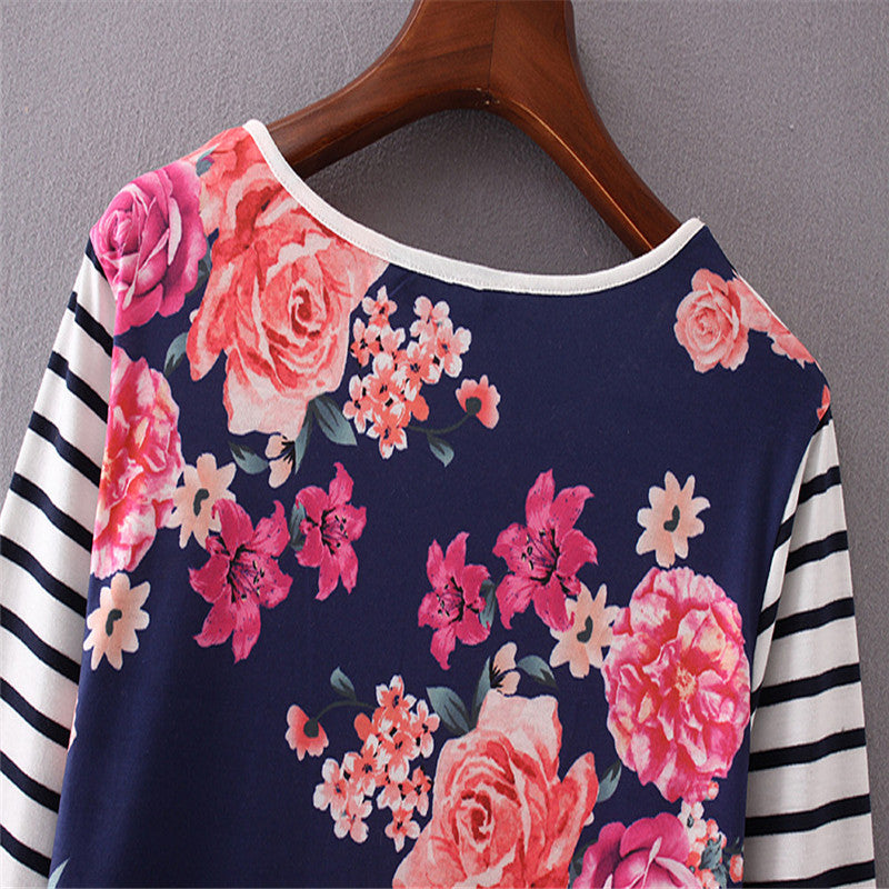 Tee Shirts For Women Floral Printed Striped Splice Printing Round Neck Pullover Tops T-Shirt camisetas y tops IMY66