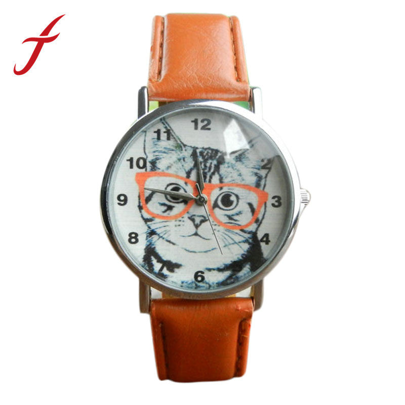 Vogue Cute Cartoon Glasses Cat Watches PU Leather Band Leisure Quartz Wrist Watch Watches For Men Women IMY66
