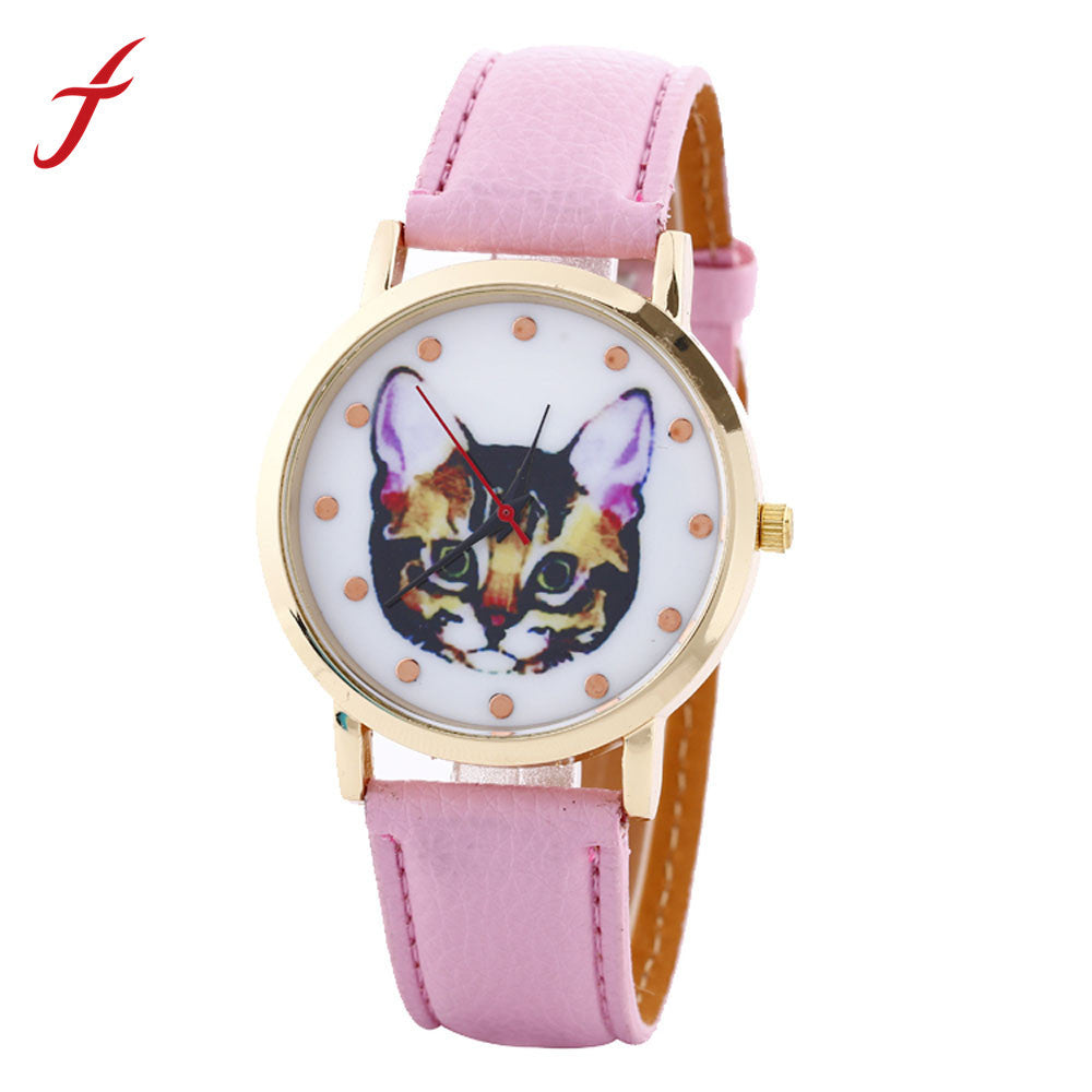 Vogue Women Girls Cartoon Cat Watches Faux Leather Band Analog Quartz Wrist Watch Reloj Clock Hours IMY66