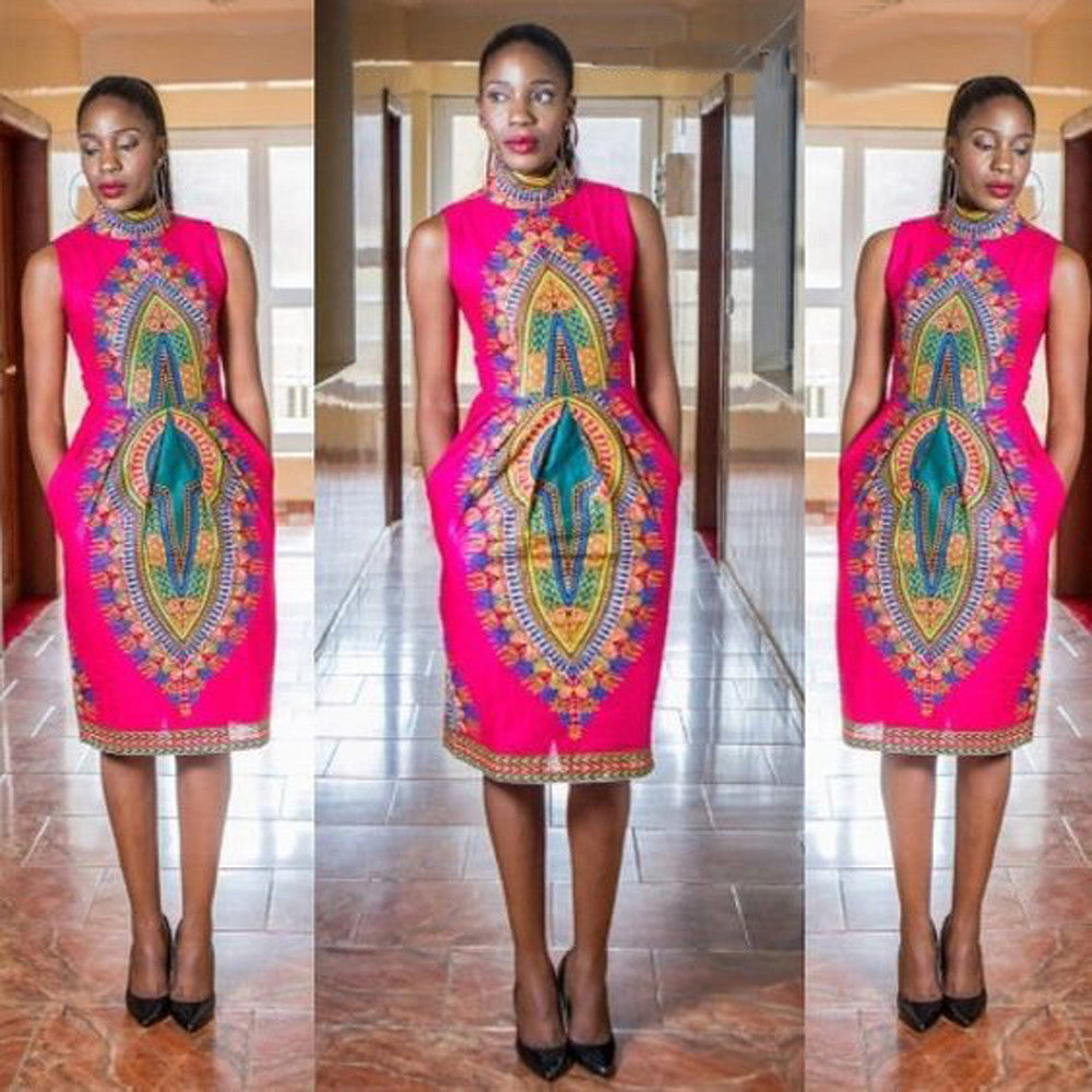Women African Print Dress Elegant Casual Straight Print Kaftan Sleeveless Dress vestidos femininos IMY66