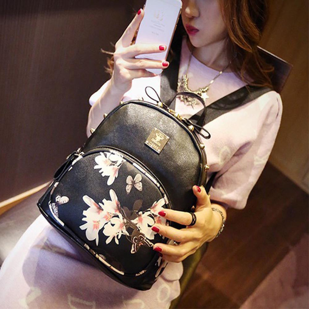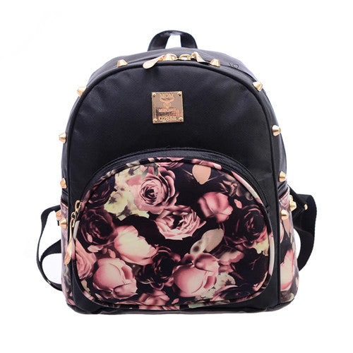 Women Backpack Causal Rivet Floral Printing PU Leather Backpacks For Girls mochilas mujer IMY66