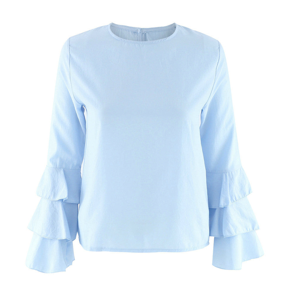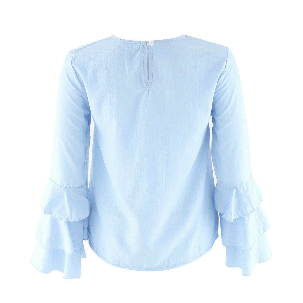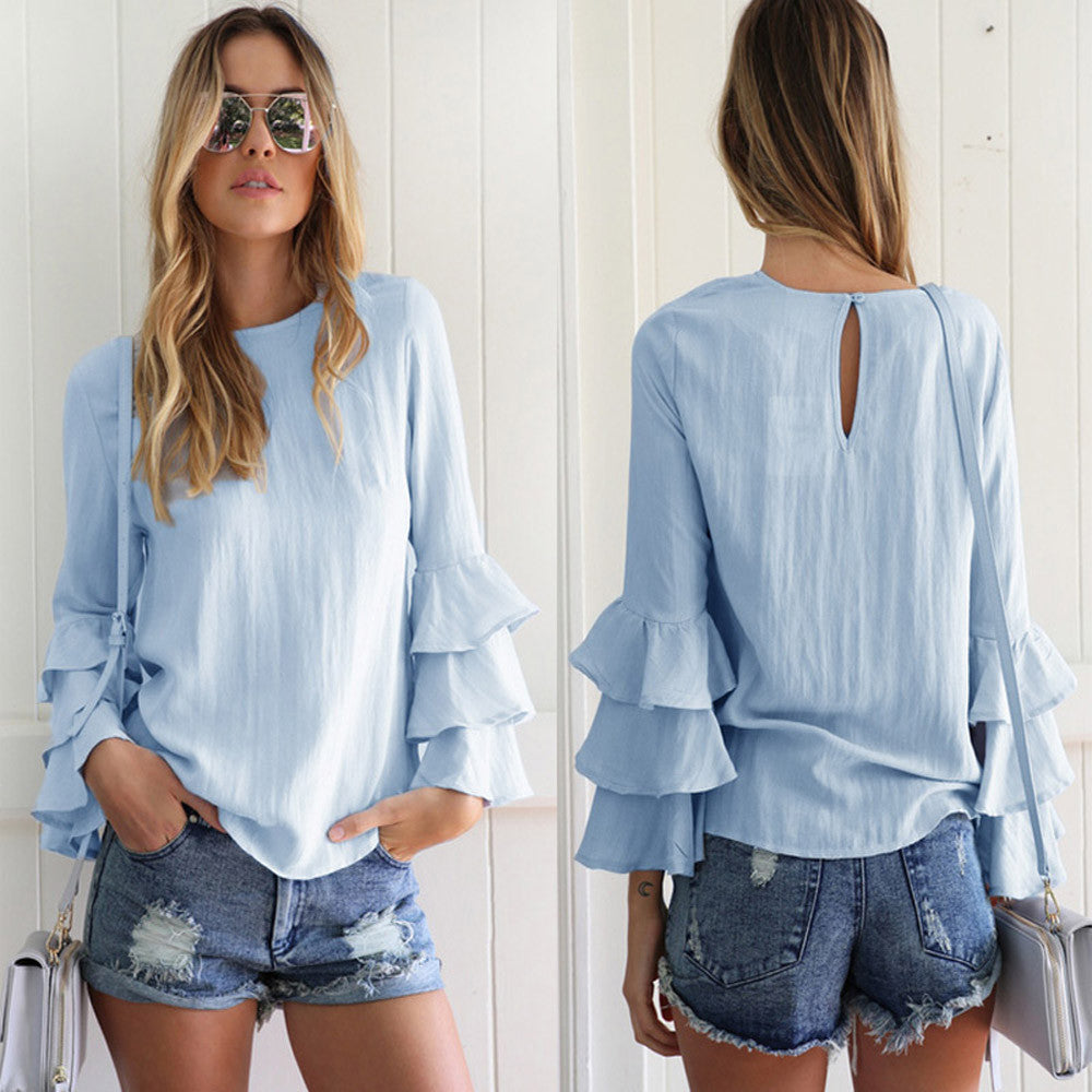 Women Blouses Casual Loose Folding Sleeves Long Sleeve Round Neck Tops Blouse blusa feminina IMY66