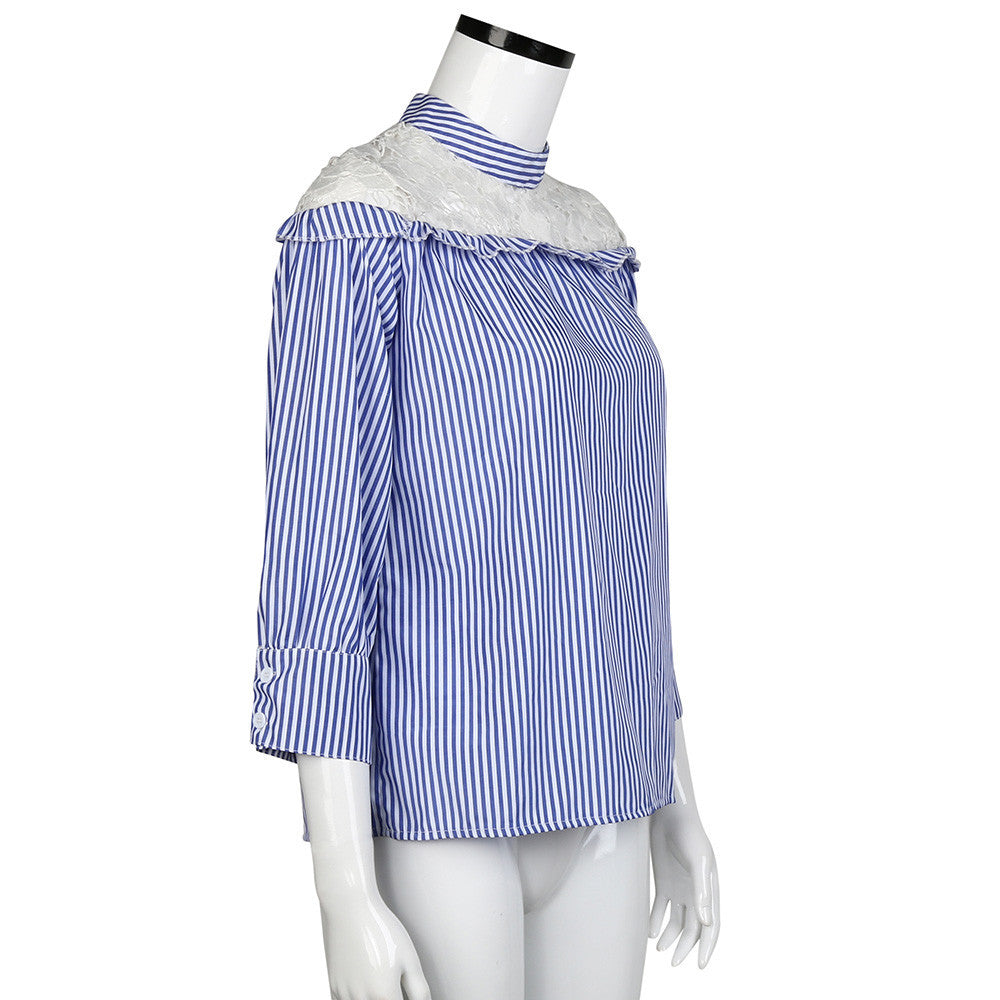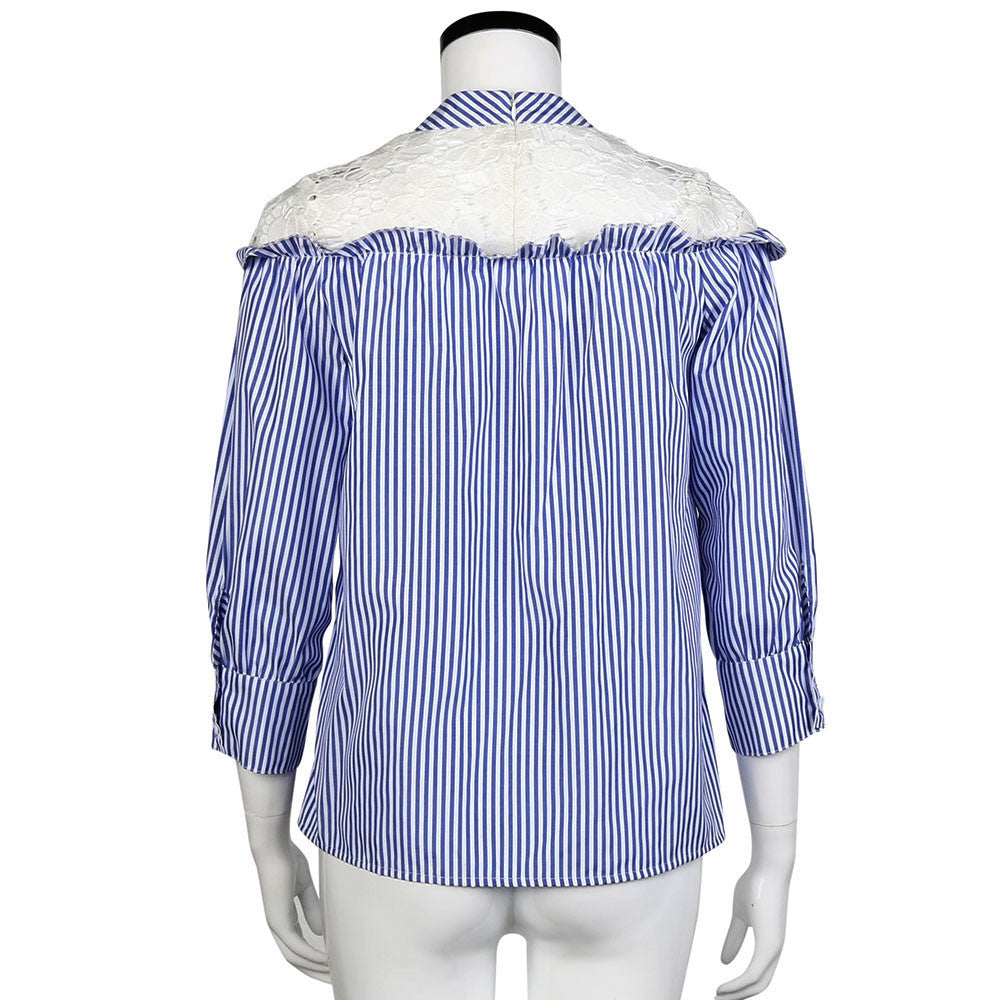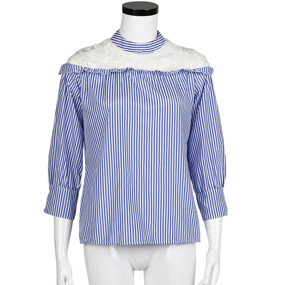 Women Blouses Navy Vertical Striped Lace Splice Half Sleeve Shirts Casual Blouse blusa feminina IMY66