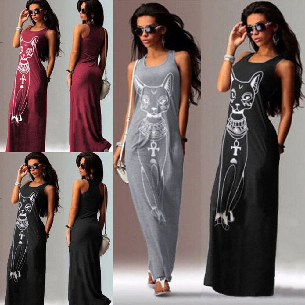 Women Casual Dress Sexy Sleeveless Cat Printed Long Maxi Party Beach Dress Vest Sundress vestidos IMY66