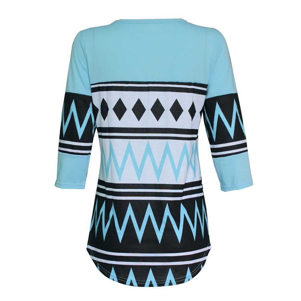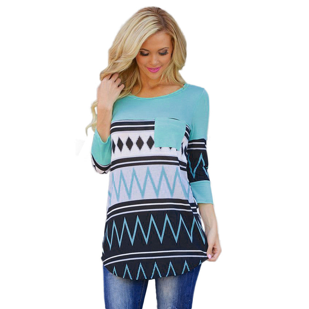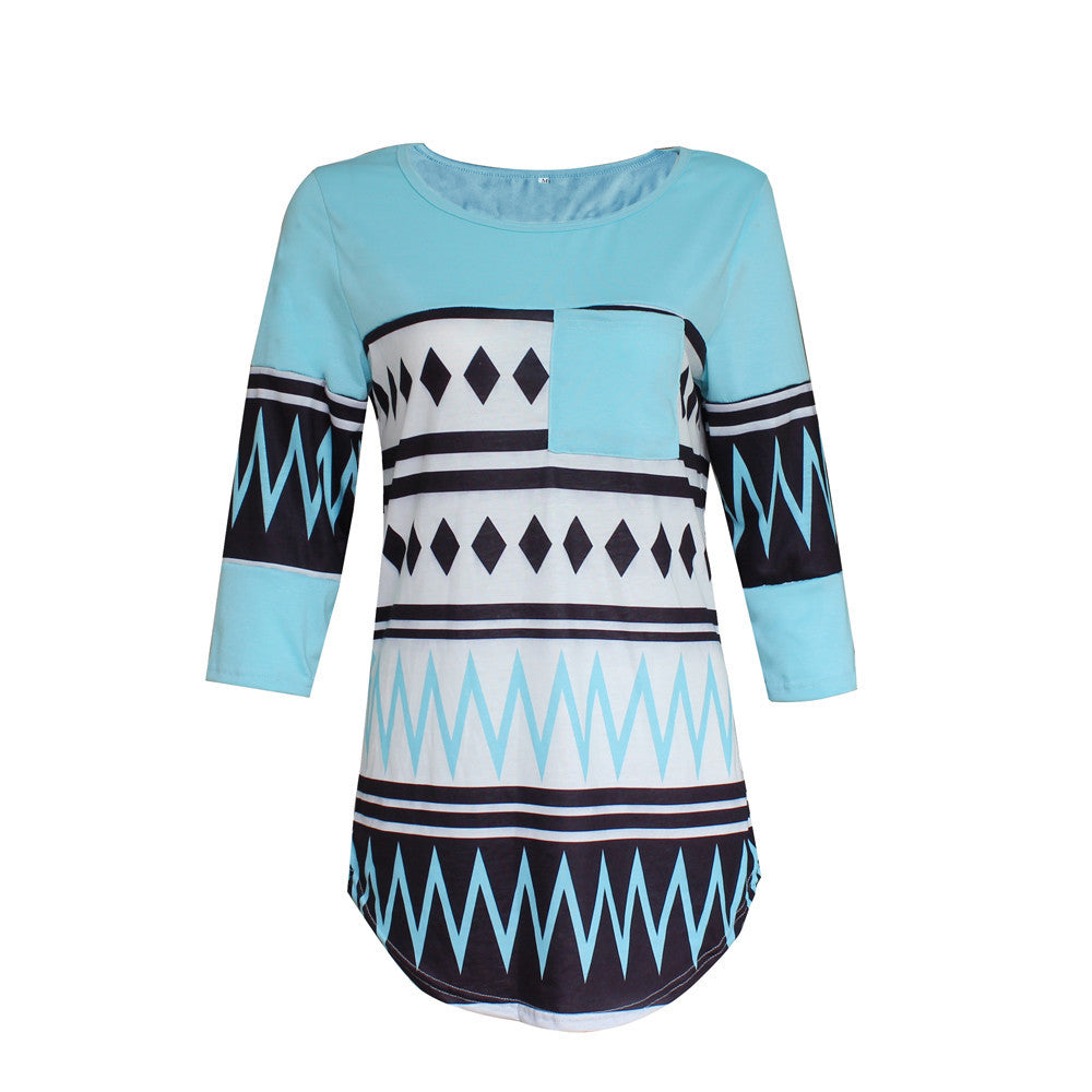 Women Casual Geometry Print T-Shirts Long Sleeve Pocket Cotton Tee Shirt femme Loose camisetas y tops IMY66