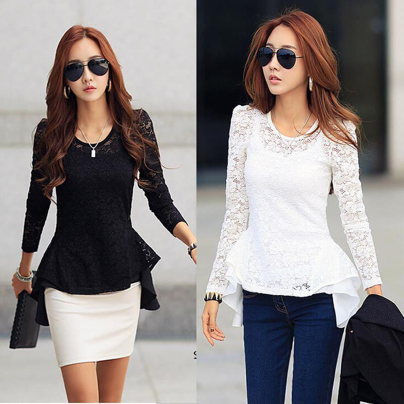 Women Casual Lace Crochet Chiffon Fishtail Spliting Work Wear Long Sleeve White Blouse Top Bottoming Shirt IMY66