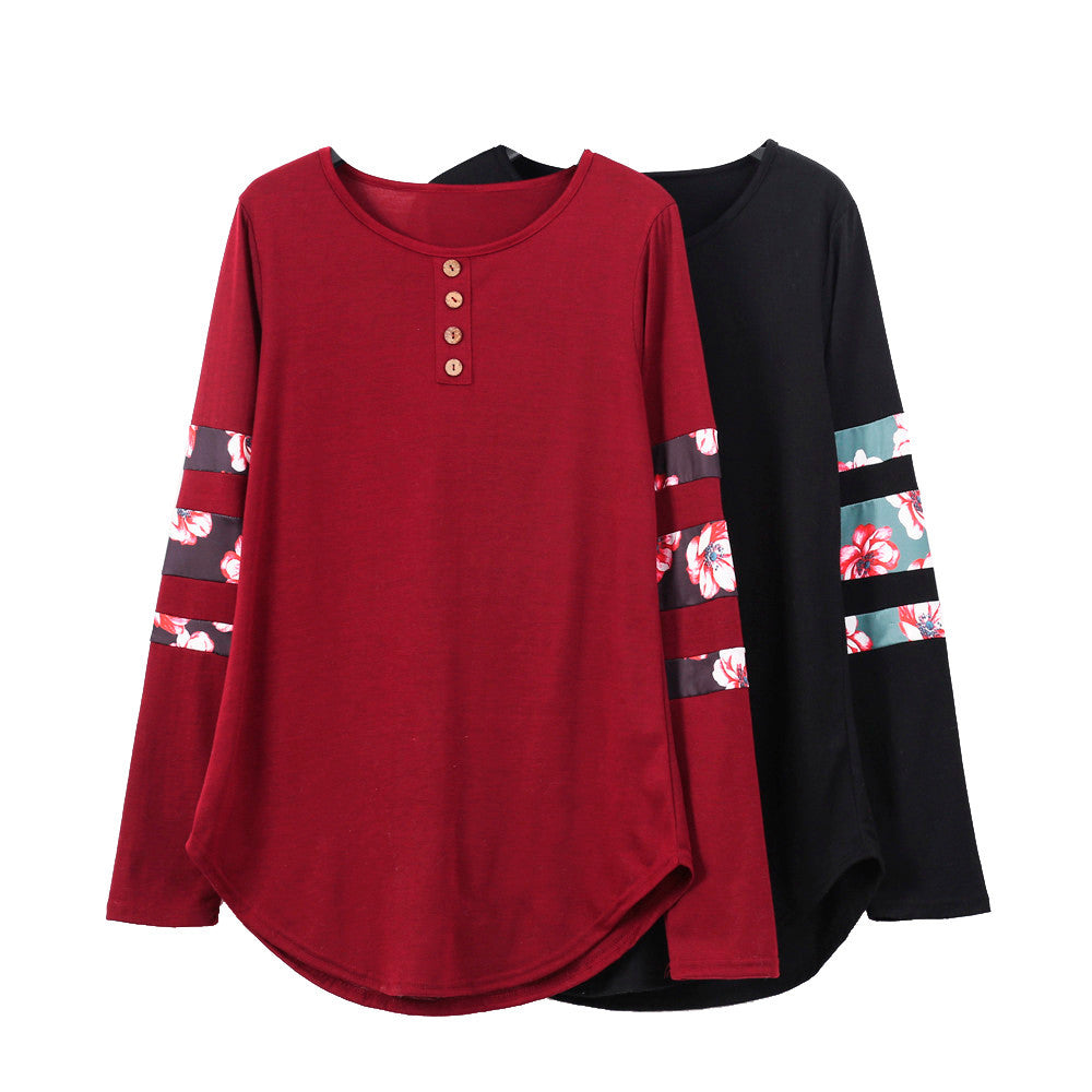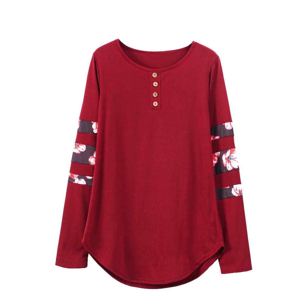 Women Casual Long Sleeve T-Shirts Long Sleeve Cotton Button Floral Print Splice Pullover T-Shirt Tops camisetas y tops IMY66