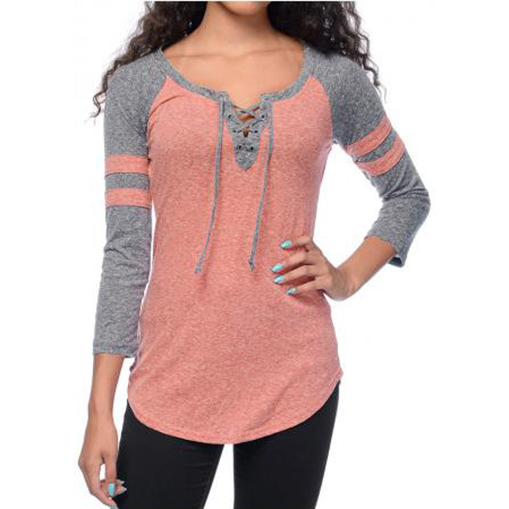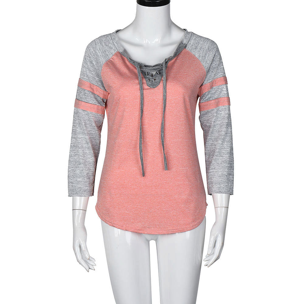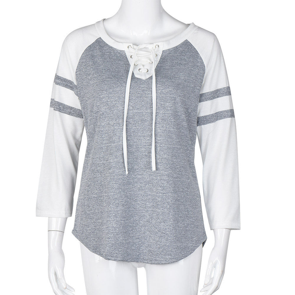 Women Casual T-Shirts Sexy Round Neck Lace Up Splicing Long Sleeve V-Neck Tops camisetas y tops Vetement Femme IMY66