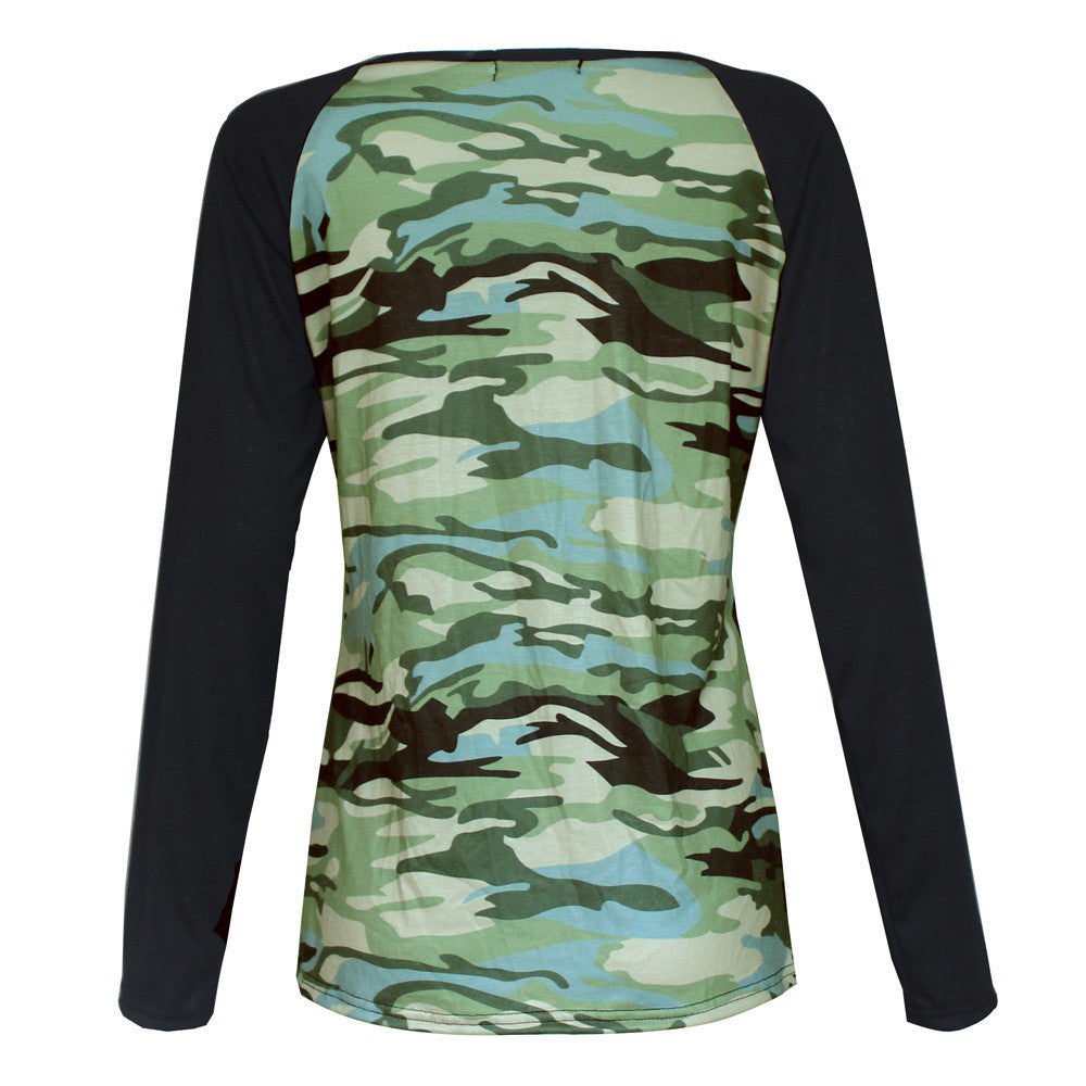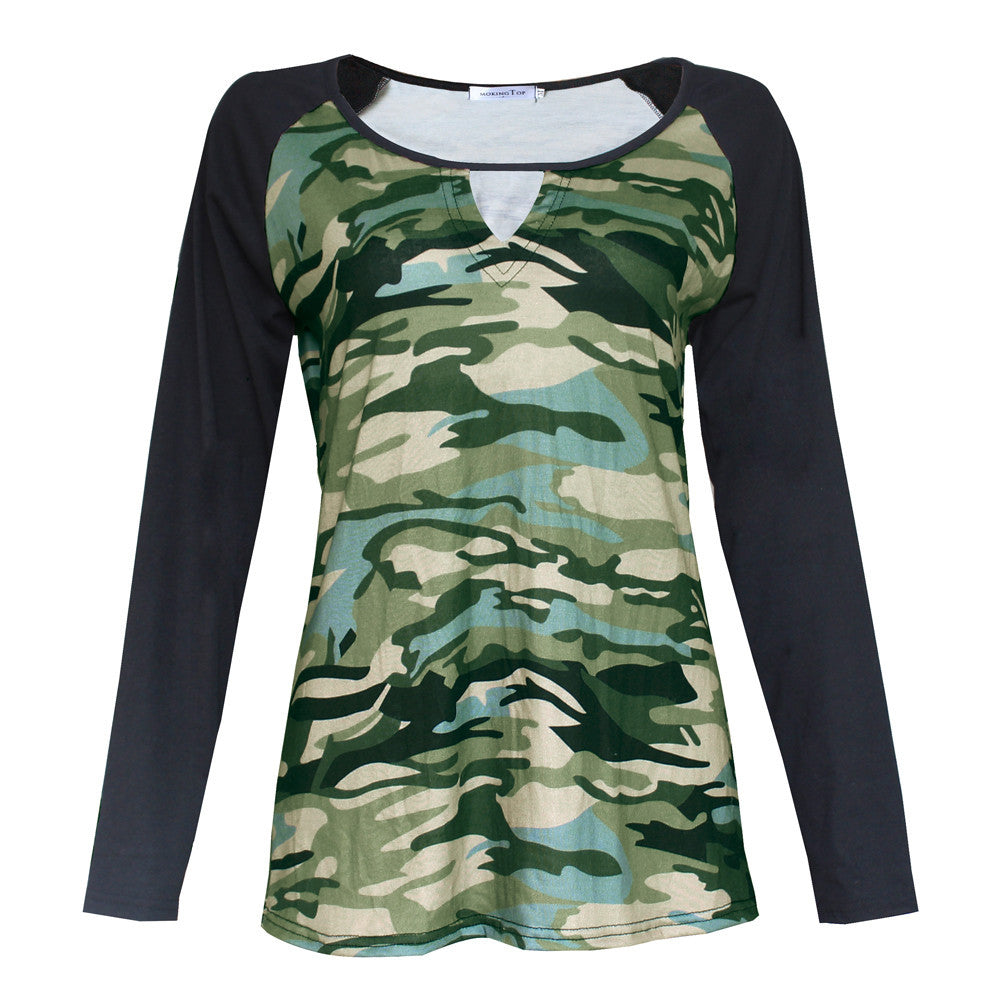 Women Clothing Sexy Slim Long Sleeve Hollow Round Neck Camouflage Printed Casual T-shirt camisetas y tops IMY66