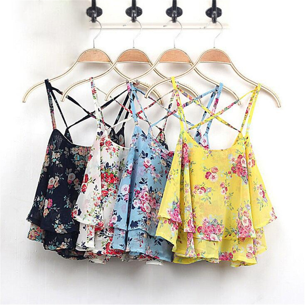 Women Clothing Spaghetti Strap Tank Tops Floral Print Chiffon Shirt Vest Blouses Crop Tops blusas feminina IMY66
