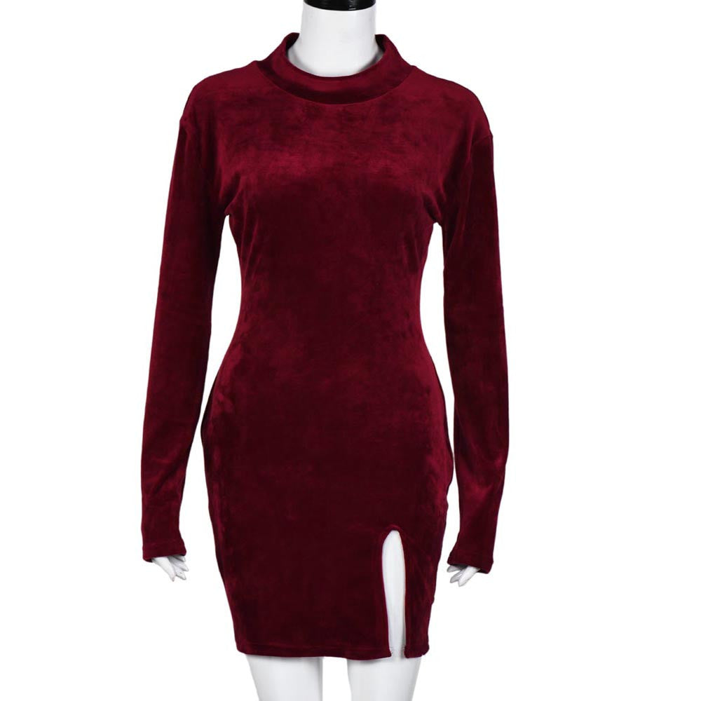 Women Club Party Dress Sexy Turtleneck Slit Velvet Bodycon Bandage Long Sleeve Mini Dress vestido feminino IMY66