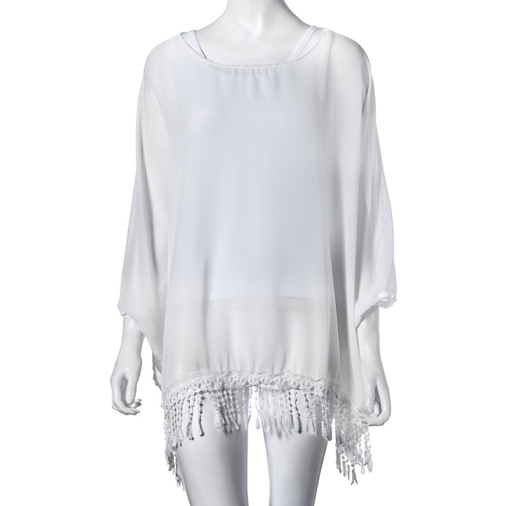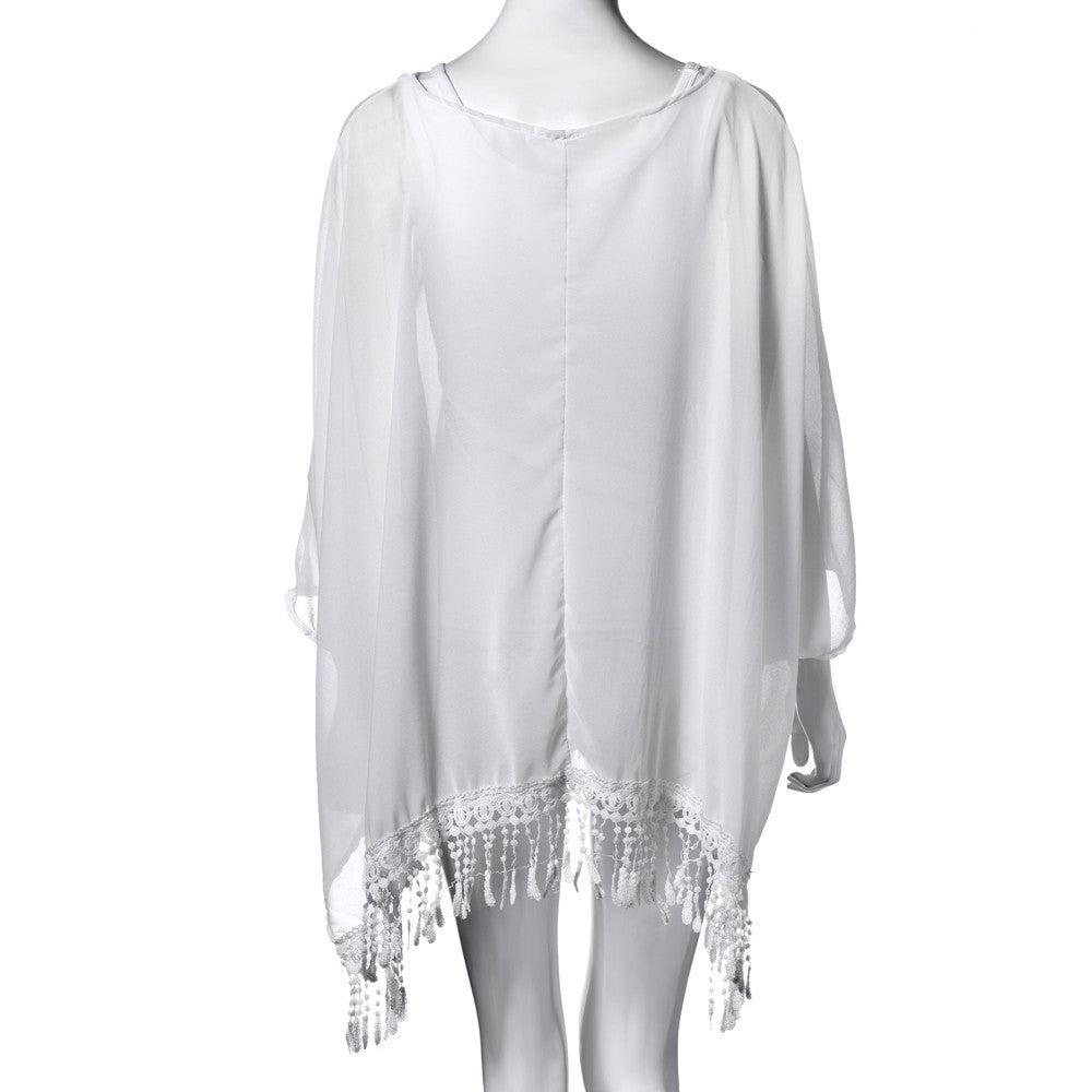 Women Dress O Neck Lace Tassel Chiffon Beach Mini Dresses Casual White Short Party Vestidos Bohemian IMY66
