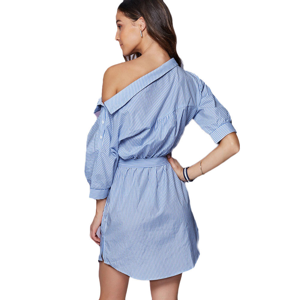 Women Dress Sexy Half Sleeve Striped Off Shoulder Casual Tie WaisT-Shirt Dress Vestidos femininos IMY66
