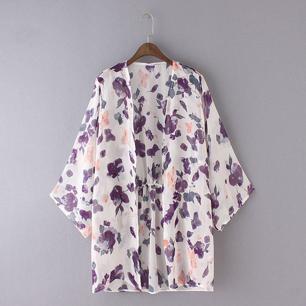 Women Kimono Cardigan Chiffon Blouse Floral Print Shawl Bikini Beach Cover Up Blouse Blouses blusa feminina IMY66