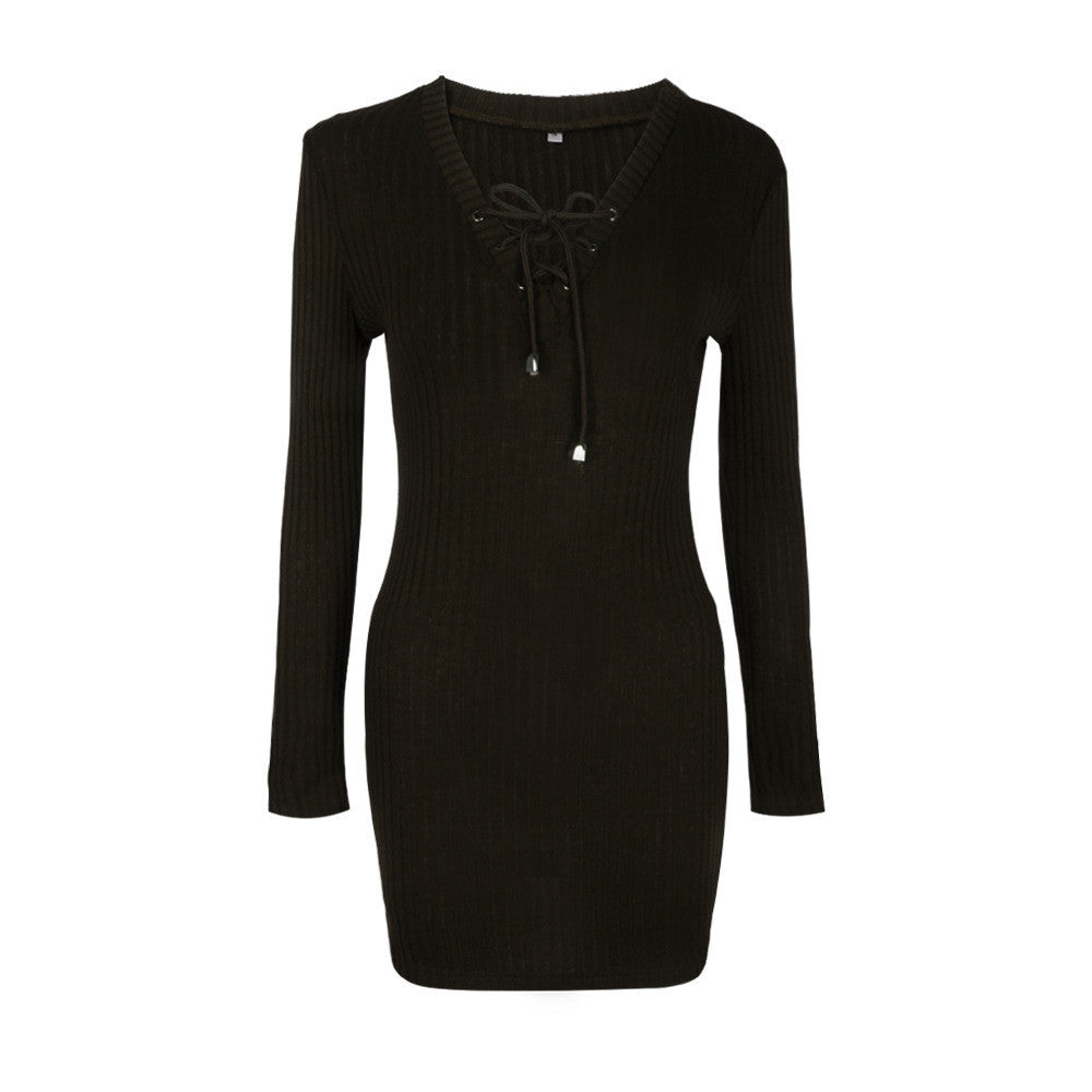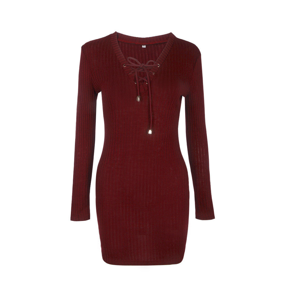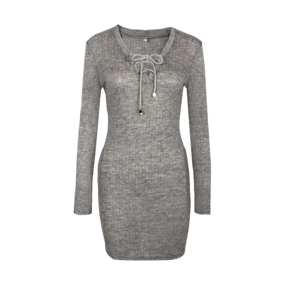 Women Knitted Sweater Dress Sexy Lace Up Long Sleeve BodyCon Bandage Sweater Mini Dress vestidos femininos IMY66