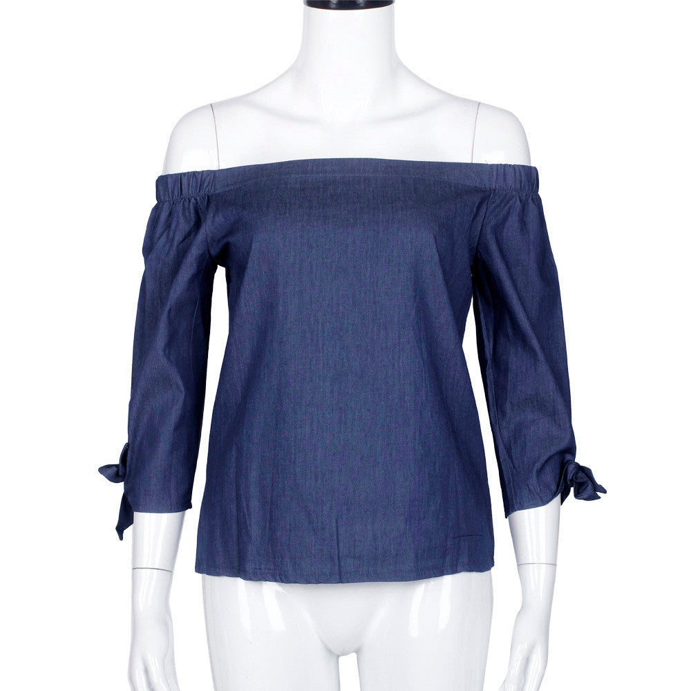 Women Lady Sexy Off Shoulder Blouse Casual Tie Sleeve Denim Jeans Shirts Tops Blouses blusas femininas IMY66