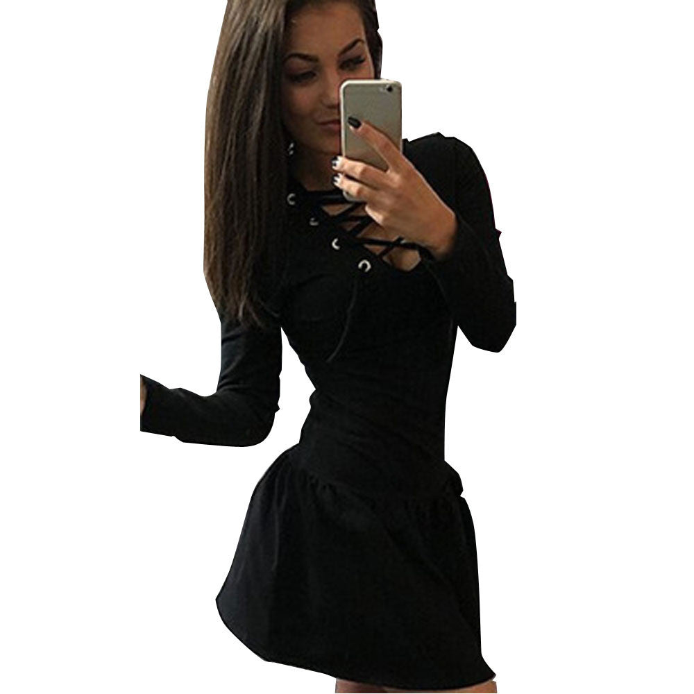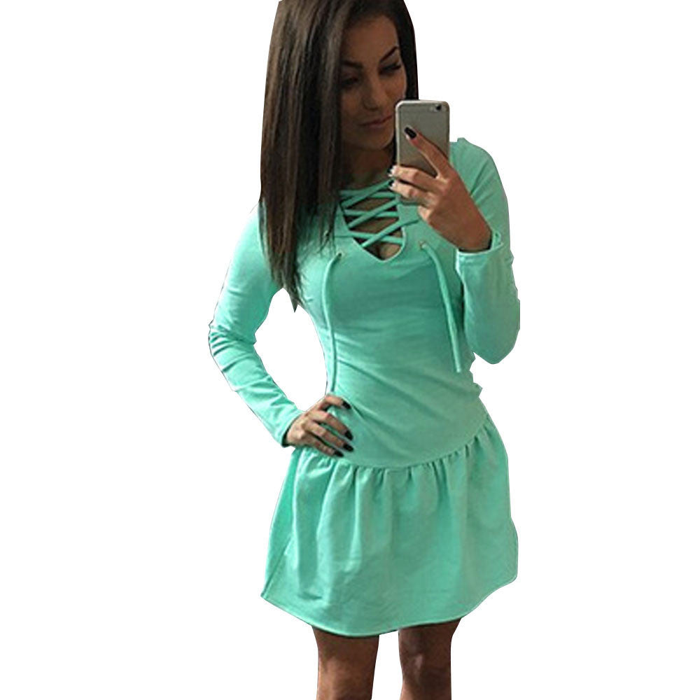 Women Long Sleeve Dress Sexy V Neck Lace Up Bandage Flounced Casual Party Mini Bodycon Dress Vestidos Femininos IMY66