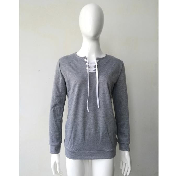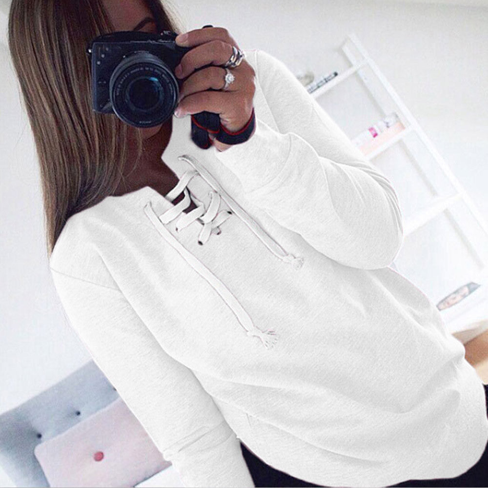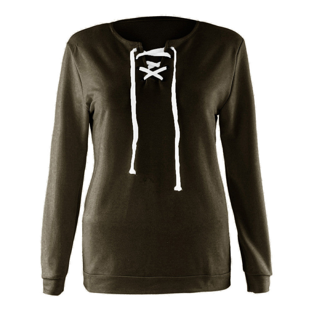 Women Long Sleeve Sweatershirts Solid Casual Lace-up Pullover Tee Shirts femme camisetas y tops IMY66